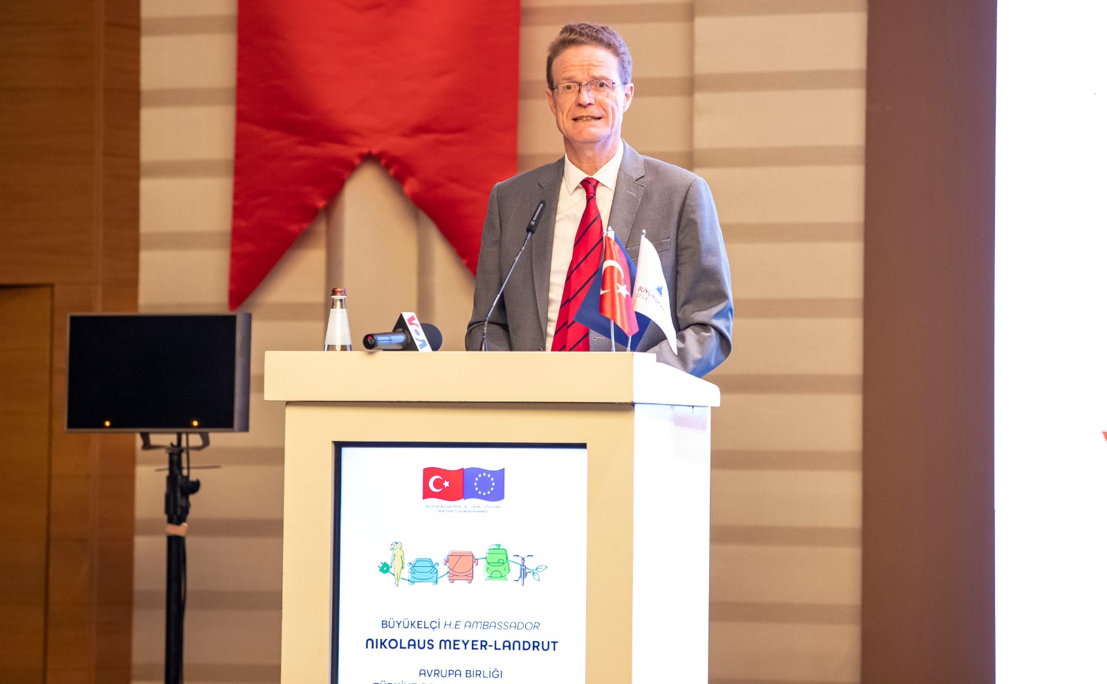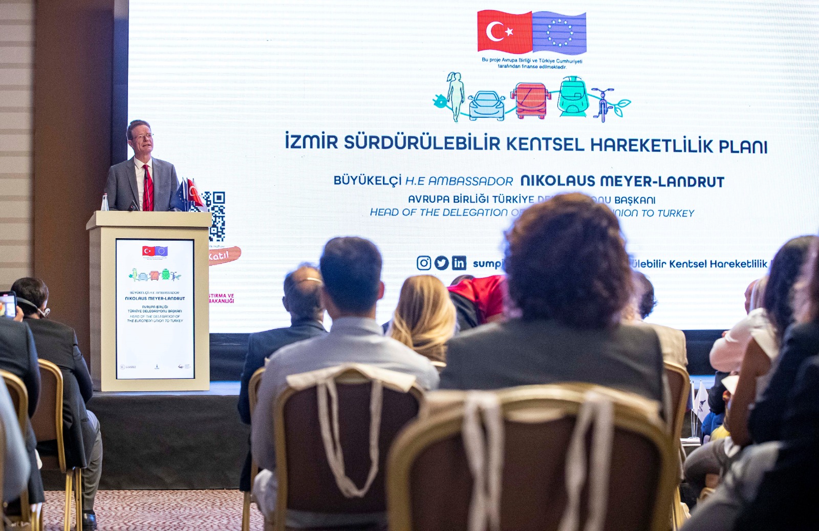 Diğer açılış konuşmasını yapan AB Türkiye Delegasyonu Başkanı Büyükelçi Nikolaus Meyer-Landrut ise şöyle konuştu: “İzmir’in Sürdürülebilir Kentsel Hareketlilik Planı’nın startını ‘Otomobilsiz Kent Günü’nde veriyoruz, bunun bir tesadüf olmadığını düşünüyorum. İzmir, Sürdürülebilir Kentsel Hareketlilik Planlamasına geçişte de öncü rolü rol oynuyor. Sürdürülebilir Kentsel Hareketlilik Planı, İzmir için insan odaklı, erişilebilir, emniyetli, sağlık odaklı dirençli bir ulaşım vizyonu oluşturacak. Geleneksel ulaşım planlamasından farkı odağında araçlar değil insanın ve çevreye saygının olması. Proje belediyenin imar, çevre gibi birçok biriminden ekipler ile yürütülecek, paydaşların ve vatandaşların vizyonun belirlenmesinde geniş söz hakkı olacak.”