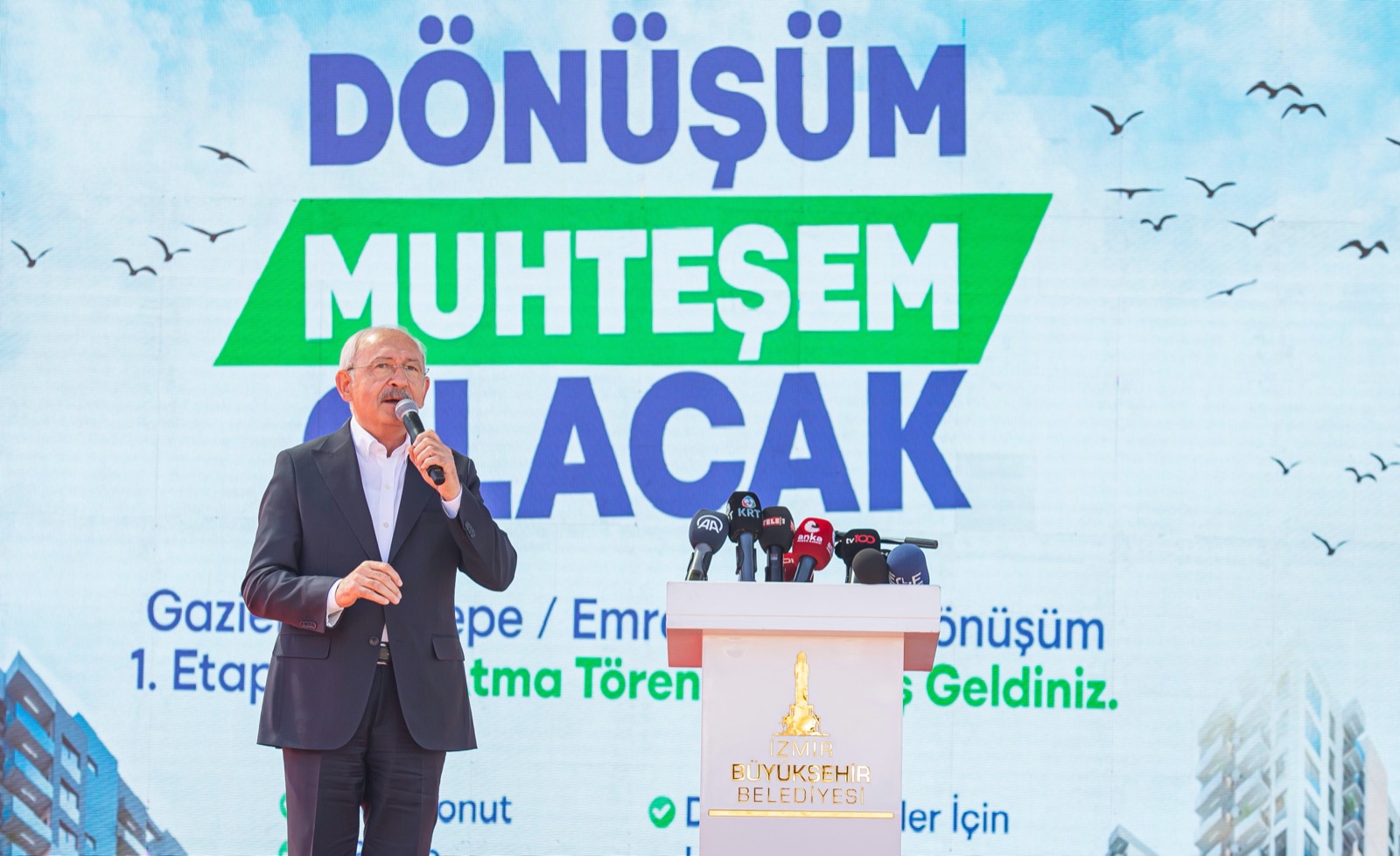 İzmir Büyükşehir Belediyesi’nin yüzde 100 uzlaşı ve yerinde dönüşüm ilkeleriyle kentsel dönüşüm çalışmalarını yürüttüğü Gaziemir Aktepe Emrez’de birinci etabın temeli törenle atıldı. CHP Genel Başkanı Kemal Kılıçdaroğlu törende, “İktidarın yapamadığını belediye başkanlarımız yapıyor. İzmir milletvekili olduğum için gurur duyuyorum” dedi. İzmir Büyükşehir Belediye Başkanı Tunç Soyer de genç bir İzmir inşa etmek için var güçleriyle çalıştıklarını belirtti.