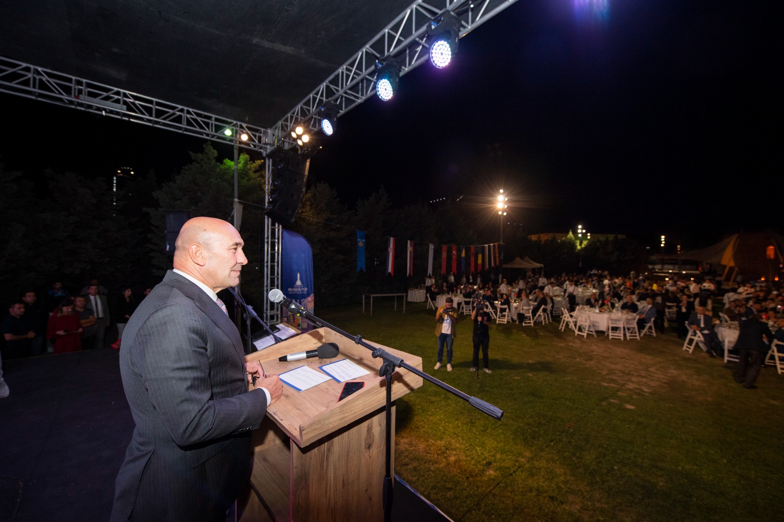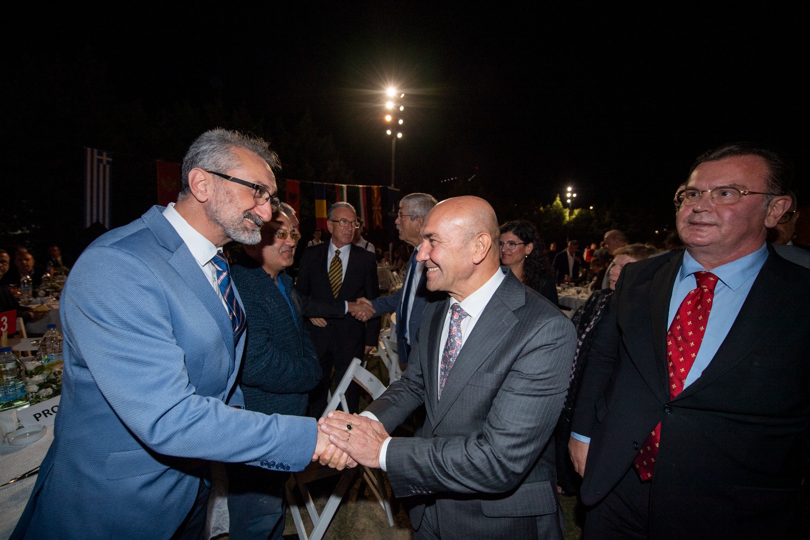 Gecede konuşan İzmir Büyükşehir Belediye Başkanı Tunç Soyer, “Bugün, yalnızca büyükşehir belediye başkanı olarak değil Piriştine’den Ege’ye yerleşen Arnavut Mustafa Çavuş’un torunu olarak aranızdayım. İzmir’imiz, bir Balkan Türkü olan benim dedeme, onun tüm kader arkadaşlarına ve biz torunlarına kucak açtı. Yaralarımızı sardı, can oldu. Biliyorum ki, demokrasinin beşiği olan bu coğrafyada ve şehrimizin cesur insanlarının yüreğinde çok güçlü bir maya var. O mayanın adı uyum. Bu yüzden İzmir, her daim barışın ve hoşgörünün şehri olmuştur. Demokrasinin tohumları buradan tüm dünyaya yayılmıştır” dedi.