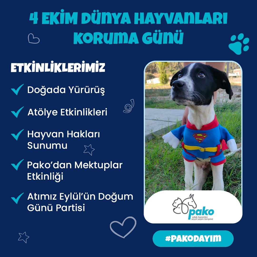 İzmir Büyükşehir Belediyesi 4 Ekim Dünya Hayvanları Koruma Günü’nü, sokak hayvanlarının bakımı, tedavisi ve sahiplendirilmesinde Avrupa standartlarında hizmet veren Pako Sokak Hayvanları Sosyal Yaşam Kampüsü’nde kutlamaya hazırlanıyor. Kampüste hayvan sevgisinin ve hayvanları koruma bilincinin küçük yaşta oluşturulması için 10.00-15.30 arasında etkinlikler düzenlenecek. Etkinlikler arasında hayvanlarla doğa yürüyüşü, masal atölyesi, maske yapım atölyesi ve hayvan hakları sunumu da yer alacak.