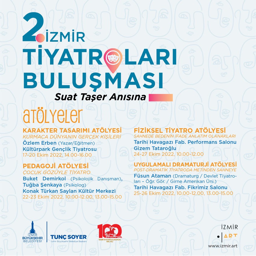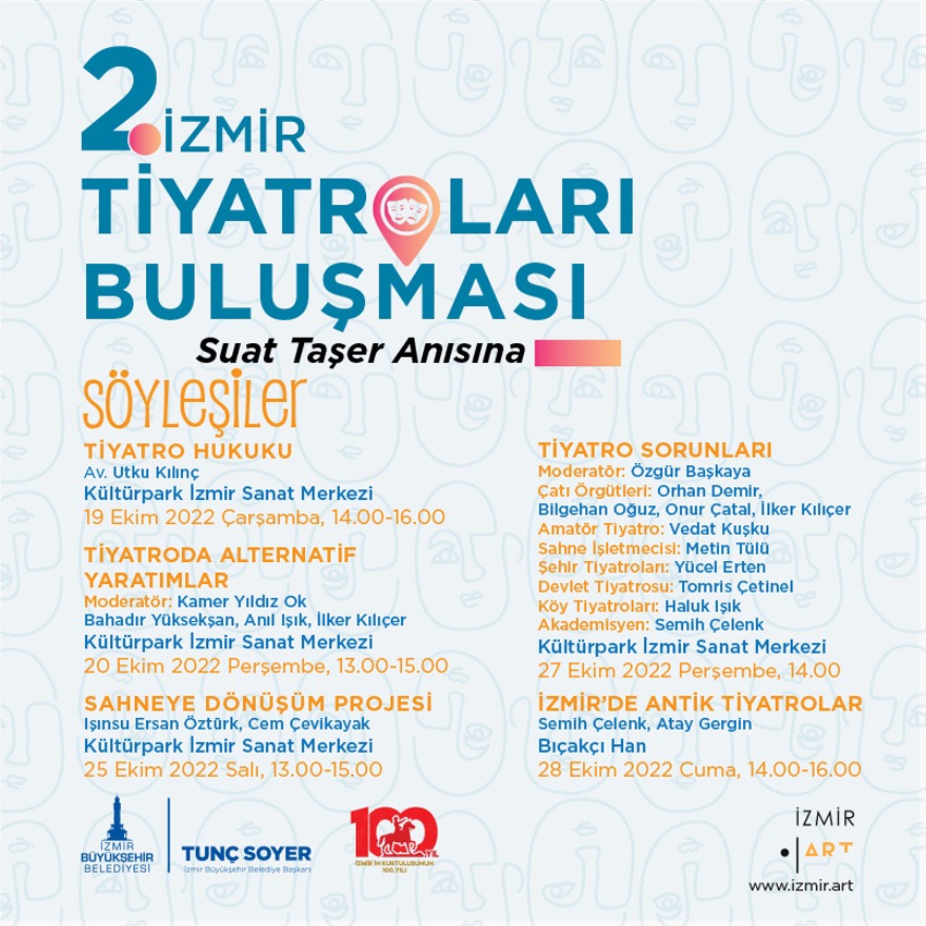 İzmir Büyükşehir Belediyesi bu yıl ikinci kez düzenlediği İzmir Tiyatroları Buluşması kapsamında 15-30 Ekim tarihleri arasında 7 ayrı ilçede 15 yetişkin, 5 çocuk oyunu, bir konuk oyun, 4 atölye ve 5 söyleşiye ev sahipliği yapacak. İzmir Büyükşehir Belediye Başkanı Tunç Soyer’in kentin sanat hayatında iz bırakmış tiyatro sanatçısı Suat Taşer anısına açılışını yapacağı 2. İzmir Tiyatroları Buluşmaları, saat 16.00’da Alsancak Kıbrıs Şehitleri Caddesi'nde düzenlenecek kortejle başlayacak.