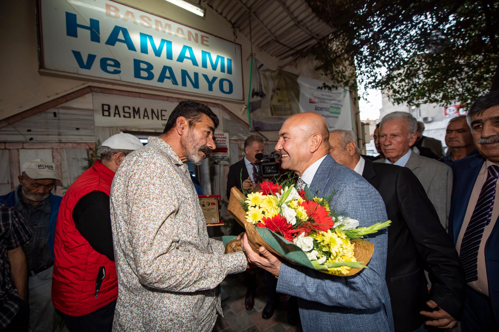 Etkinliklerin devamı için Bıçakçı Han’a doğru yürürken Basmane Hamamı'ndan İzmir Büyükşehir Belediyesi'nin desteğiyle faydalananlar evsiz yurttaşlar Başkan Soyer'e sevgi gösterisinde bulunarak çiçek verdi.