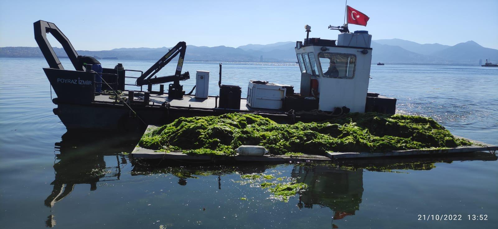 İzmir Körfezi’nde mevsimsel koşullar nedeniyle oluşan deniz marulları İzmir Büyükşehir Belediyesi ve İZSU Genel Müdürlüğü ekipleri tarafından temizleniyor. Marulların çürüyerek kokuya neden olmaması için ekipler hem karadan hem denizden çalışma yürütüyor.