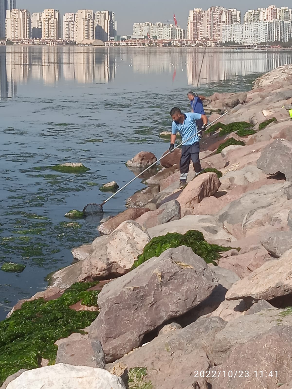 İzmir Büyükşehir Belediyesi ve İZSU Genel Müdürlüğü ekipleri mevsimsel koşullar nedeniyle oluşan deniz marullarına (ulva) karşı teyakkuzda. Bostanlı sahilinde görülen deniz marullarının çürüyerek kokuya neden olmaması için ekipler karadan ve denizden yoğun mesaisiyle bölgeyi temizliyor.