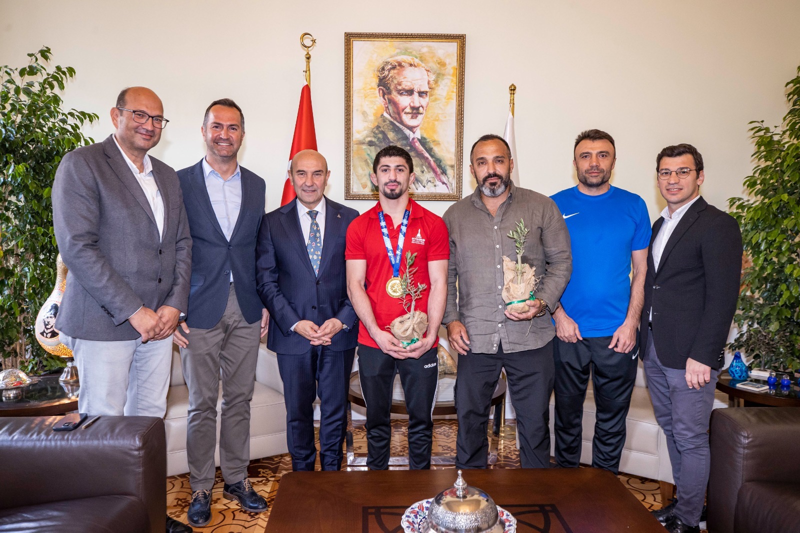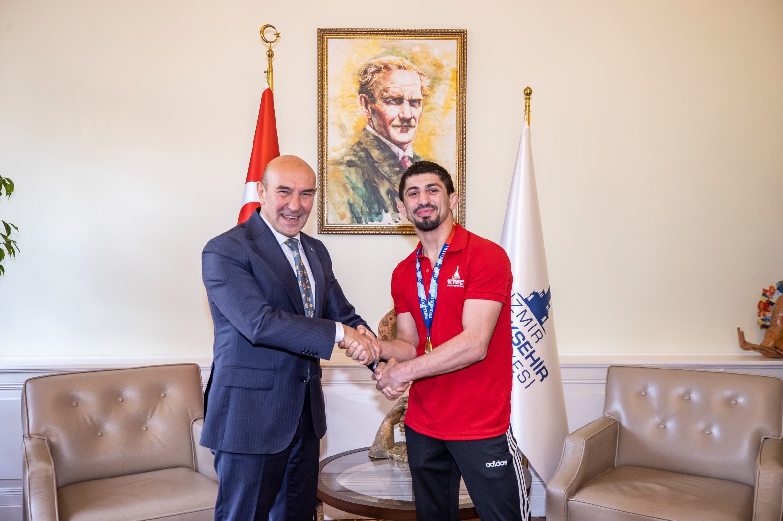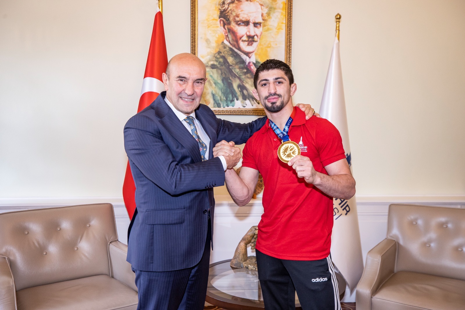 İspanya’da yapılan U23 Dünya Güreş Şampiyonası’nda altın madalya kazanan İzmir Büyükşehir Belediyesi Gençlik ve Spor Kulübü güreşçisi Kerem Kamal, İzmir Büyükşehir Belediye Başkanı Tunç Soyer’i ziyaret etti. Başkan Soyer, Kamal’ın gençler için rol model olduğunu söyledi.