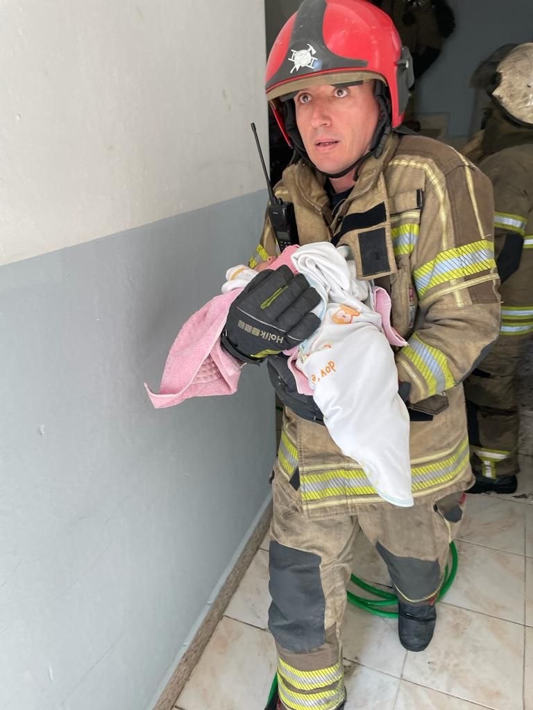 Hemen itfaiyeyi aradığını dile getiren Araz, “Yaşadığım en korkunç anlardı. Çocuğumla bekledim, ne yapacağımı bilmiyordum. Evin içi tamamen duman. İtfaiye ekiplerinin kapıyı çaldığını duydum. Ama içerisi duman olduğu için eve giremedim. Ekipler bana bebeği balkona bırakıp kapıyı açmamı söyledi. Ben de öyle yaptım. Sağ olsun itfaiye memuru hemen çocuğumu aldı, dumana maruz kalmasın diye götürdü” ifadelerini kullandı. Araz hem kendini hem de bebeğini kurtaran Yiğit Özer’e teşekkür etti.
