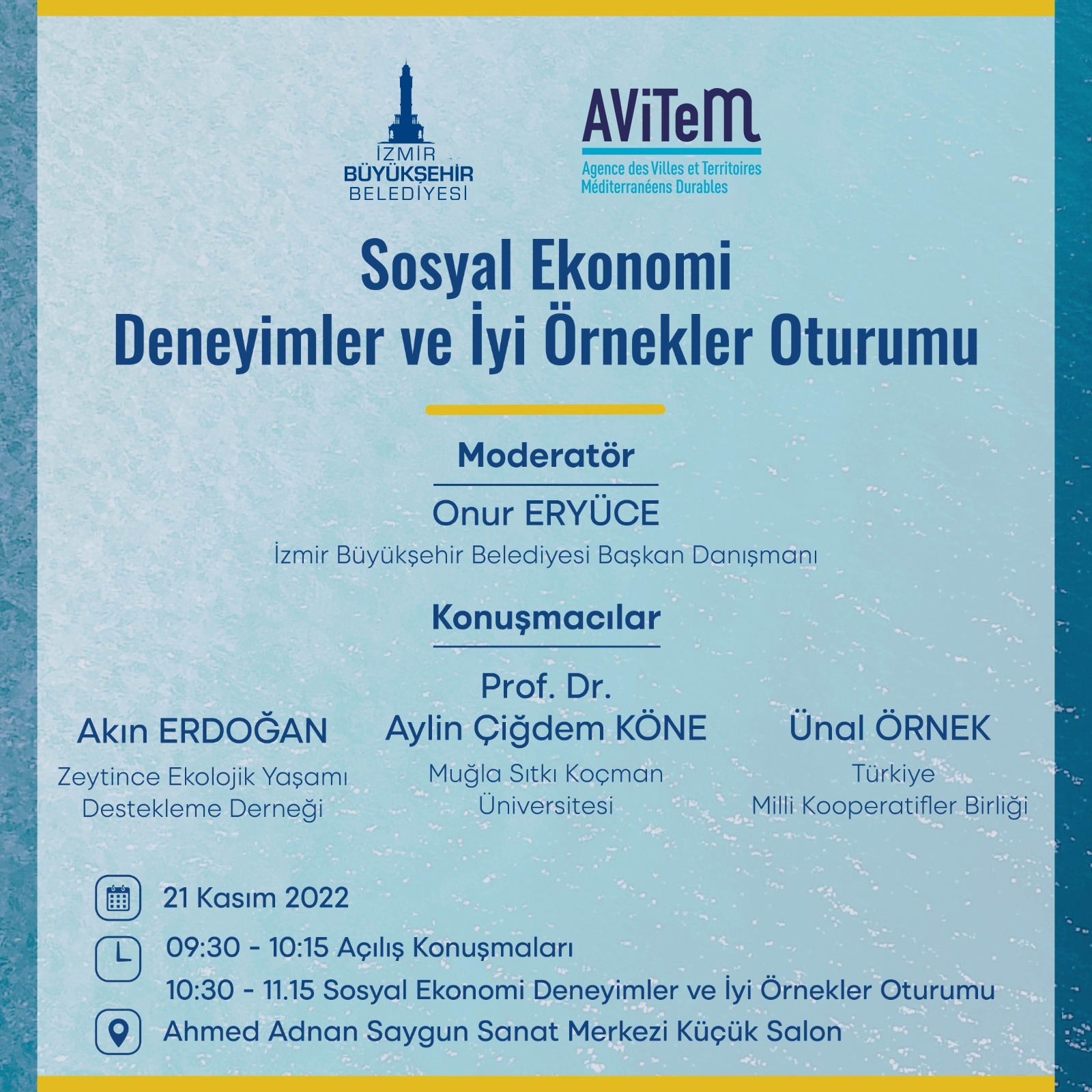 Açılış Töreni’nden sonra saat 10.30-11.15 saatlerinde Başkan Danışmanı Onur Eryüce'nin moderatörlüğünde Prof. Dr. Aylin Çiğdem Köne, Zeytince Ekolojik Yaşamı Destekleme Derneği'nden Akın Erdoğan ve Türkiye Milli Kooperatifler Birliği'nden Ünal Örnek'in katılacağı “Sosyal Ekonomi: Sosyal Ekonomi Deneyimler ve İyi Örnekler” başlıklı oturum düzenlenecek. Oturumda; rekabet temelli liberal ekonomilerin iklim, sosyal eşitsizlikler, işsizlik gibi konulara çözüm getiremediği ve sosyal ekonominin giderek önem kazandığı günümüz koşullarında İzmir Büyükşehir Belediyesi'nin bölgesel ve sosyal eşitsizliklerin giderilmesine yönelik dayanışma politikaları konuşulacak. Ayrıca Akdeniz şehirleri ve bölgesel aktörler arasındaki işbirliğinin sosyal ekonominin geliştirilmesine yönelik ne gibi çıktıları olacağı tartışılacak, deneyimlerin, ortak projelerin, bölgesel aktörlerin arasında kurulan ağların ve çalışma yöntemlerinin önemine değinilecek.
