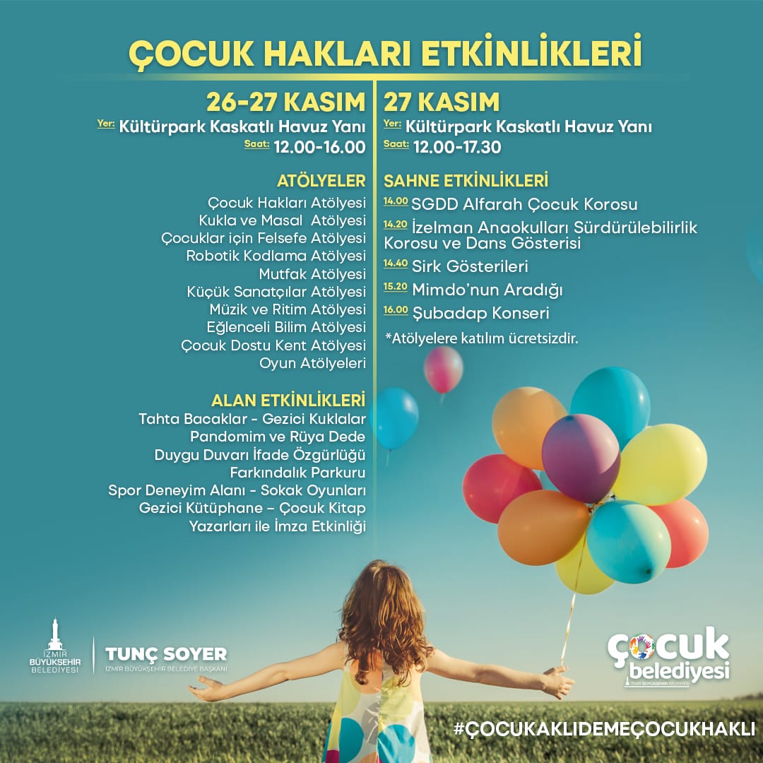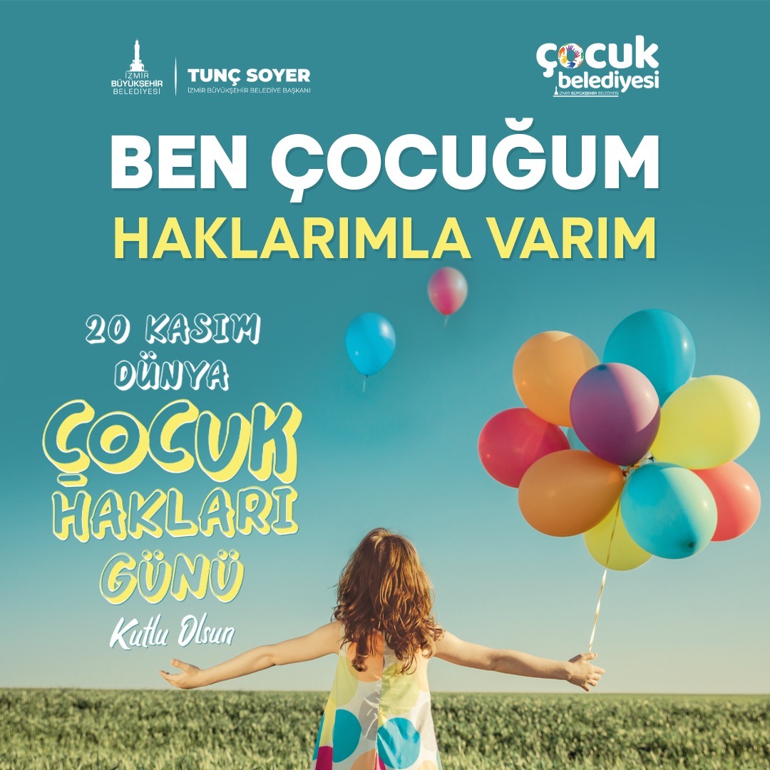 İzmir Büyükşehir Belediyesi, hava muhalefeti nedeniyle ertelenen 20 Kasım Dünya Çocuk Hakları Günü'nü 25-27 Kasım tarihlerinde bir dizi etkinlikle kutlayacak. Çocuk haklarına dikkat çekmek, çocukları korumak ve yaşam koşullarını iyileştirmek amacıyla hazırlanan program Kültürpark ile Seferihisar Çocuk Belediyesi yerleşkesinde olacak. Çocuklar iki gün boyunca keyifli vakit geçirecek.