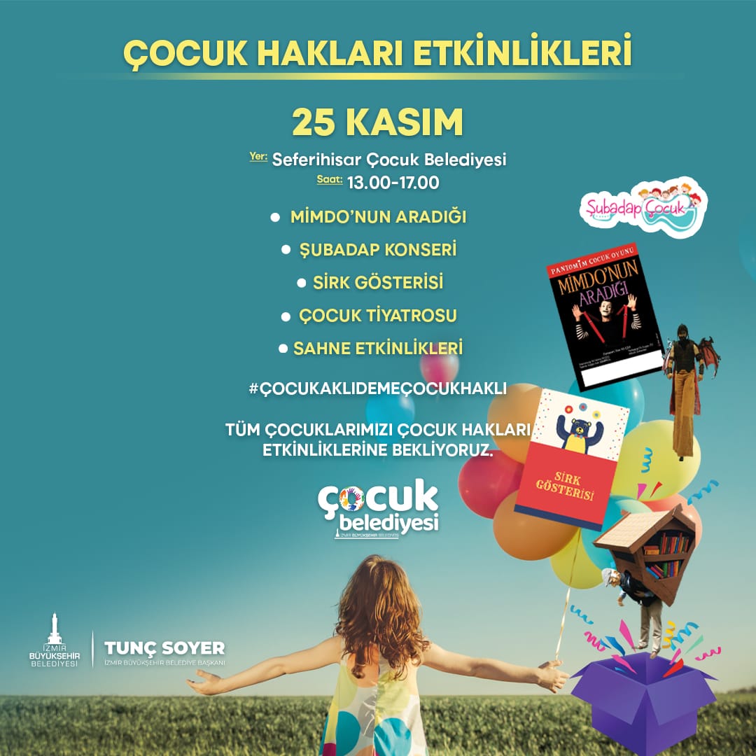 “Ben çocuğum haklarımla varım” sloganıyla İzmir Büyükşehir Belediyesi Sosyal Projeler Dairesi Başkanlığı Çocuk Belediyesi Şube Müdürlüğü tarafından düzenlenen etkinlikler kapsamında 25 Kasım Cuma günü 13.00 ile 17.00 saatleri arasında Seferihisar Çocuk Belediyesi’nde kukla, drama, pantomim, halk oyunları, tahta bacaklar, sirk gösterileri olmak üzere çok sayıda atölye kurulacak. Ayrıca çocuk tiyatrosu ile Şubadap Çocuk Konseri de olacak.