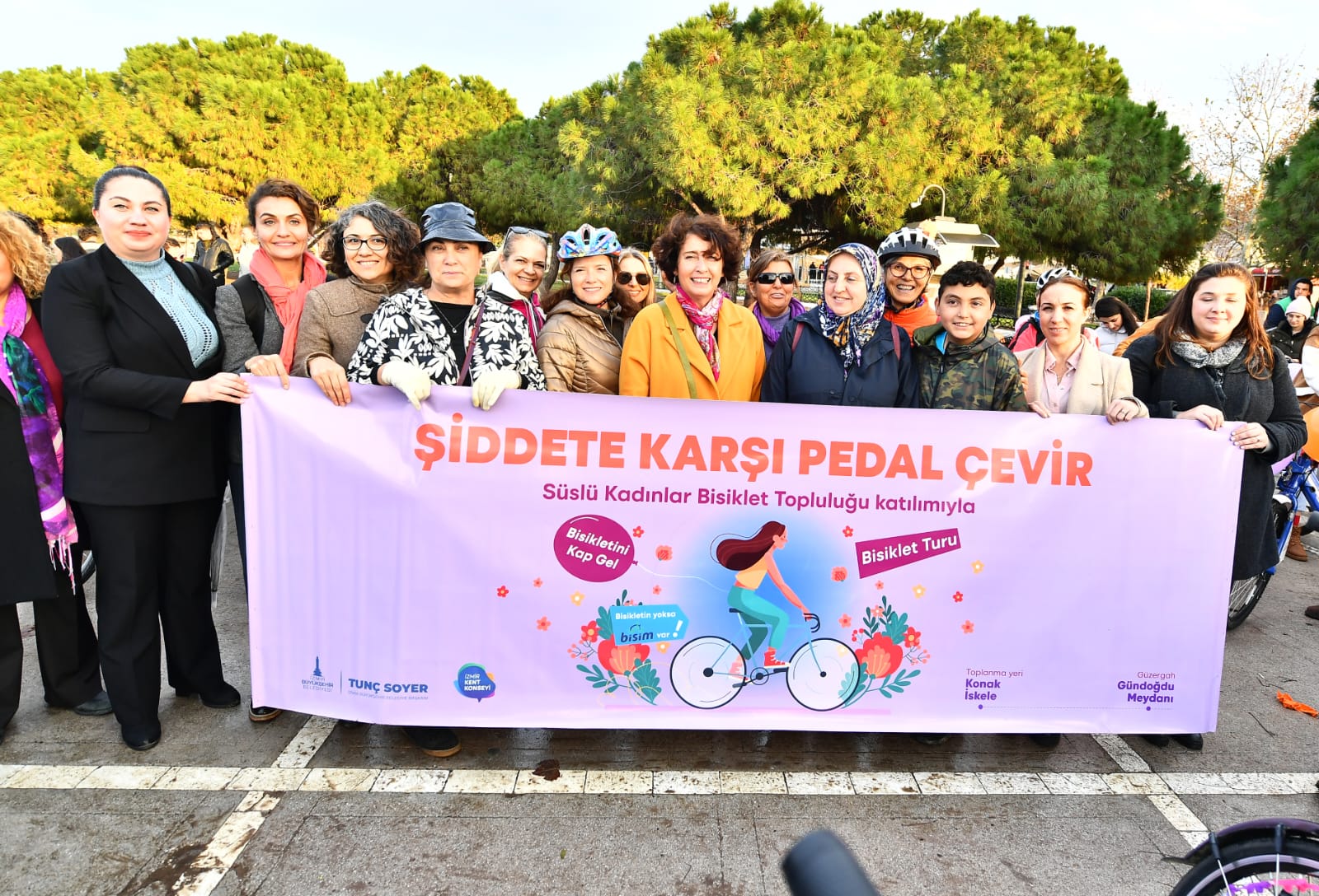 İzmir Büyükşehir Belediyesi ve Süslü Kadınlar Bisiklet Topluluğu, 25 Kasım Kadına Yönelik Şiddete Karşı Uluslararası Mücadele Günü etkinlikleri kapsamında “Şiddete Karşı Pedal Çevir” etkinliği düzenledi. Farkındalık yaratmak isteyen kadınlar Konak İskelesi’nden Alsancak Gündoğdu Meydanı’na pedal çevirdi. Etkinlikte İzmir Köy Koop Birliği Yönetim Kurulu Başkanı Neptün Soyer, İzmir Büyükşehir Belediyesi Toplumsal Cinsiyet Eşitliği Komisyonu ve İzmir Kent Konseyi Başkanı Nilay Kökkılınç, Süslü Kadınlar Bisiklet Topluluğu Kurucusu Sema Gür ve çok sayıda İzmirli kadın bisiklet kullandı.