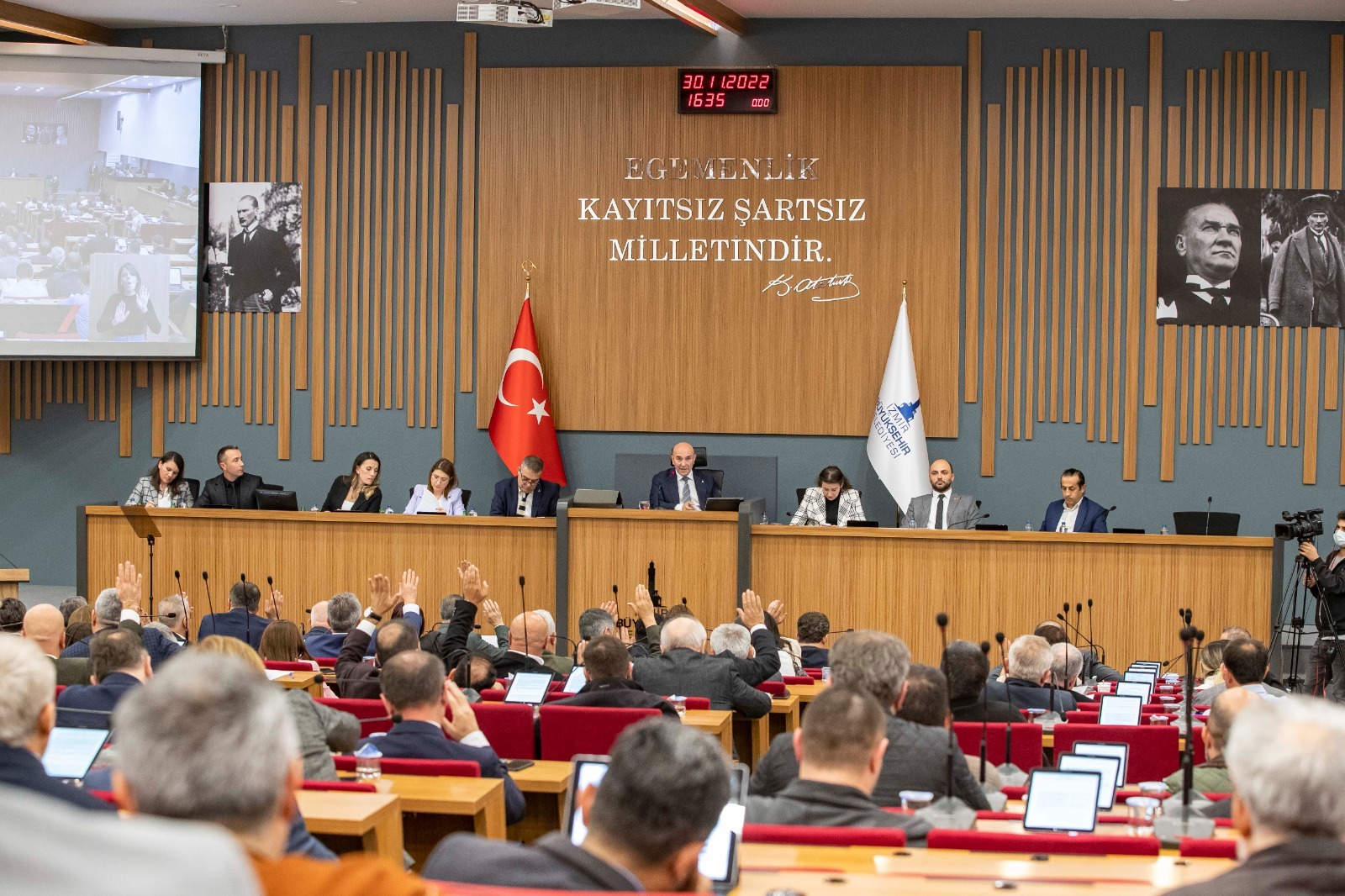 “Yüzüncü yılını geride bırakan cumhuriyetin savcılarını ve hakimlerini göreve davet ediyorum. İzmirlilerin hakkı olan çok sayıda icraatımızın sekteye uğratılmasını asla kabul etmiyoruz. Çünkü atmadığınız, beklettiğiniz her imza ya bir kamu zararı ya da kamuya zarar üretmektedir. Veyahut her ikisine birden neden olmaktadır. Açıkçası hizmetin nasıl olup da bu kadar siyasete alet edilebildiği bir noktaya geldik, bunu anlamakta güçlük çekiyorum. Siyaset kurumu böyle bir şey değildir. Vatandaşın aleyhine siyaset yapamazsınız. Şunu lütfen unutmayın. İzmir düşman toprağı değildir. İzmirliye bunlar reva görülemez. İzmir, bu ülkenin 81 ilinden biridir. Ayrılmaz bir parçasıdır. İzmir’in Ankara’da bekleyen işleri sadece bu şehrin belediye başkanı olarak beni değil, hangi partiden olursa olsun İzmirlilerin oylarıyla bu salona gelen tüm meclis üyelerimizi bağlar.