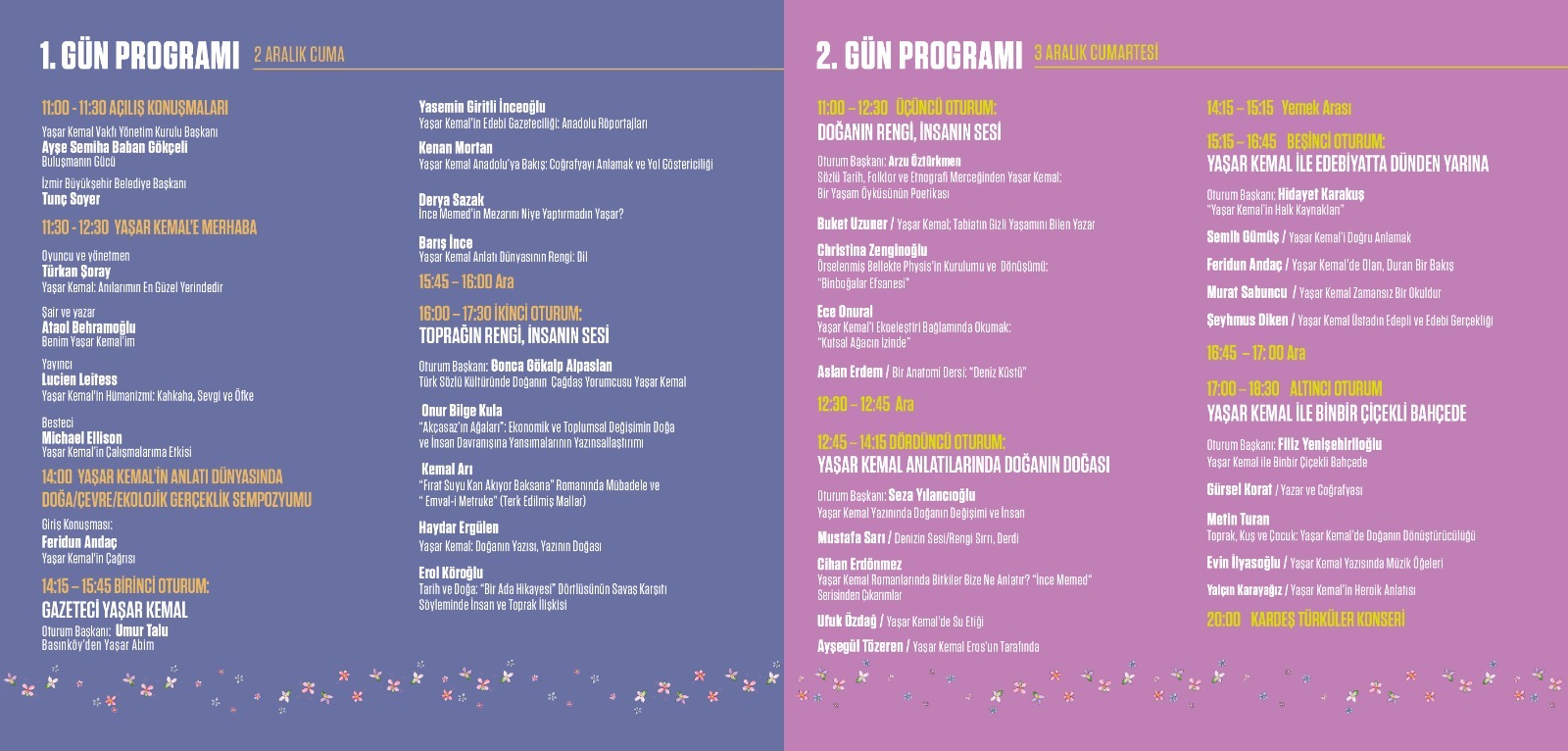 Sanatçı, edebiyatçı, gazeteci ve bilim insanları sempozyum kapsamında ön oturum da dahil olmak üzere 7 oturumda Yaşar Kemal ve onun edebiyatı hakkında konuşacak. Sempozyum kapsamında usta yazarın ilk kez İzmirlilerle buluşacak fotoğraflarından oluşan sergi de ziyaret edilebilecek. Oturumların ardından yine AASSM’de Kardeş Türküler ücretsiz konser verecek. Halkın katılımına açık konser 3 Aralık Cumartesi günü 20.00’de başlayacak.