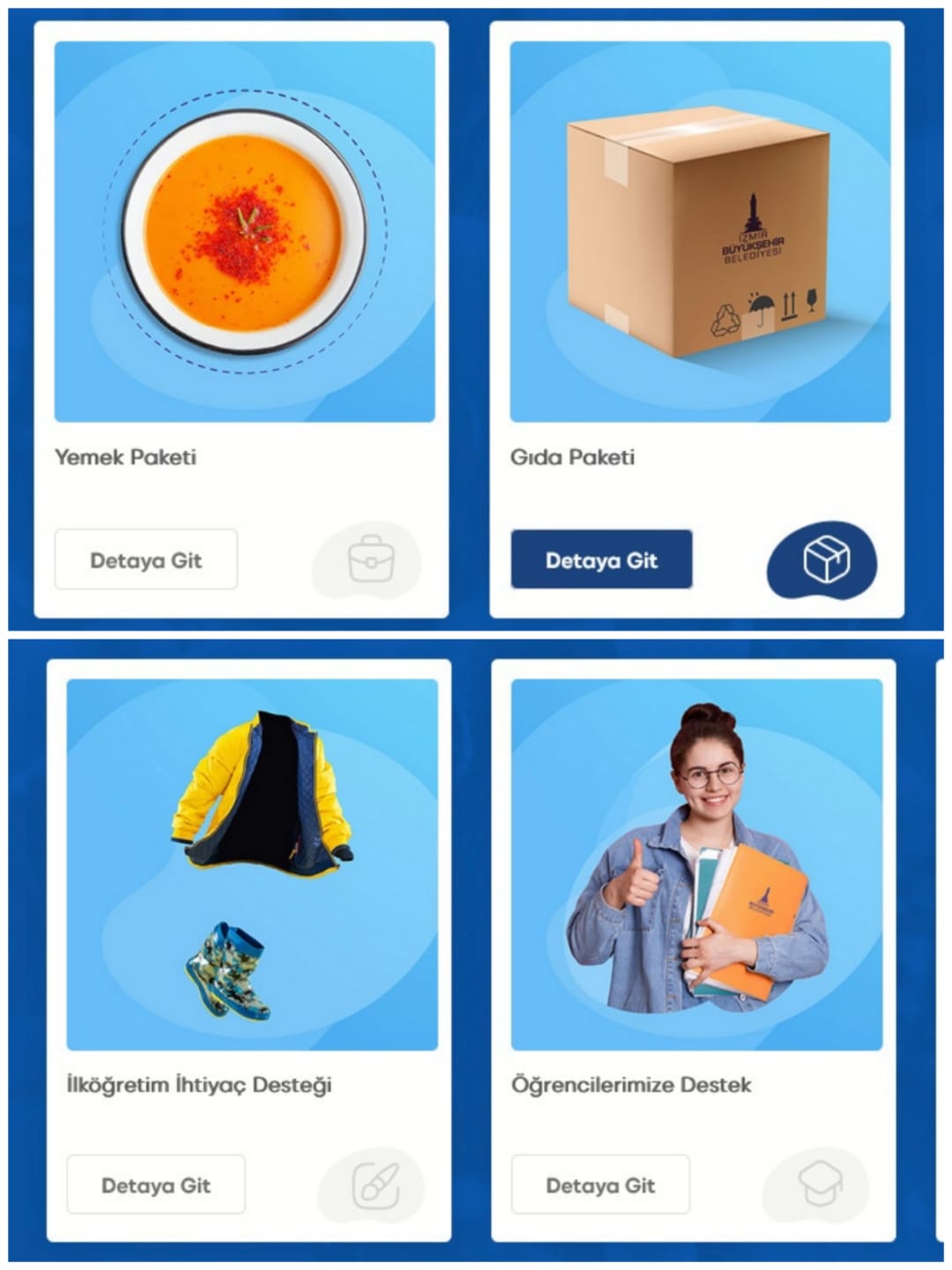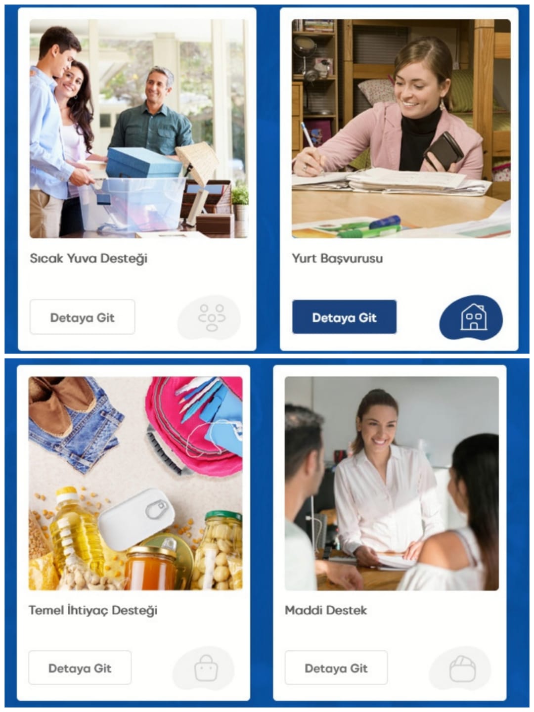 “Destek Ver” sekmesinde ise yemek, gıda kolisi, temizlik paketi, ilköğretim ihtiyaç desteği ve öğrencilere destek seçenekleri yer alıyor. Üniversite öğrencilerine destek olmak isteyenler “Maddi destek olmak istiyorum” ve “Evimde yer vermek istiyorum” seçeneklerinden birini ya da her ikisini de seçebiliyor.