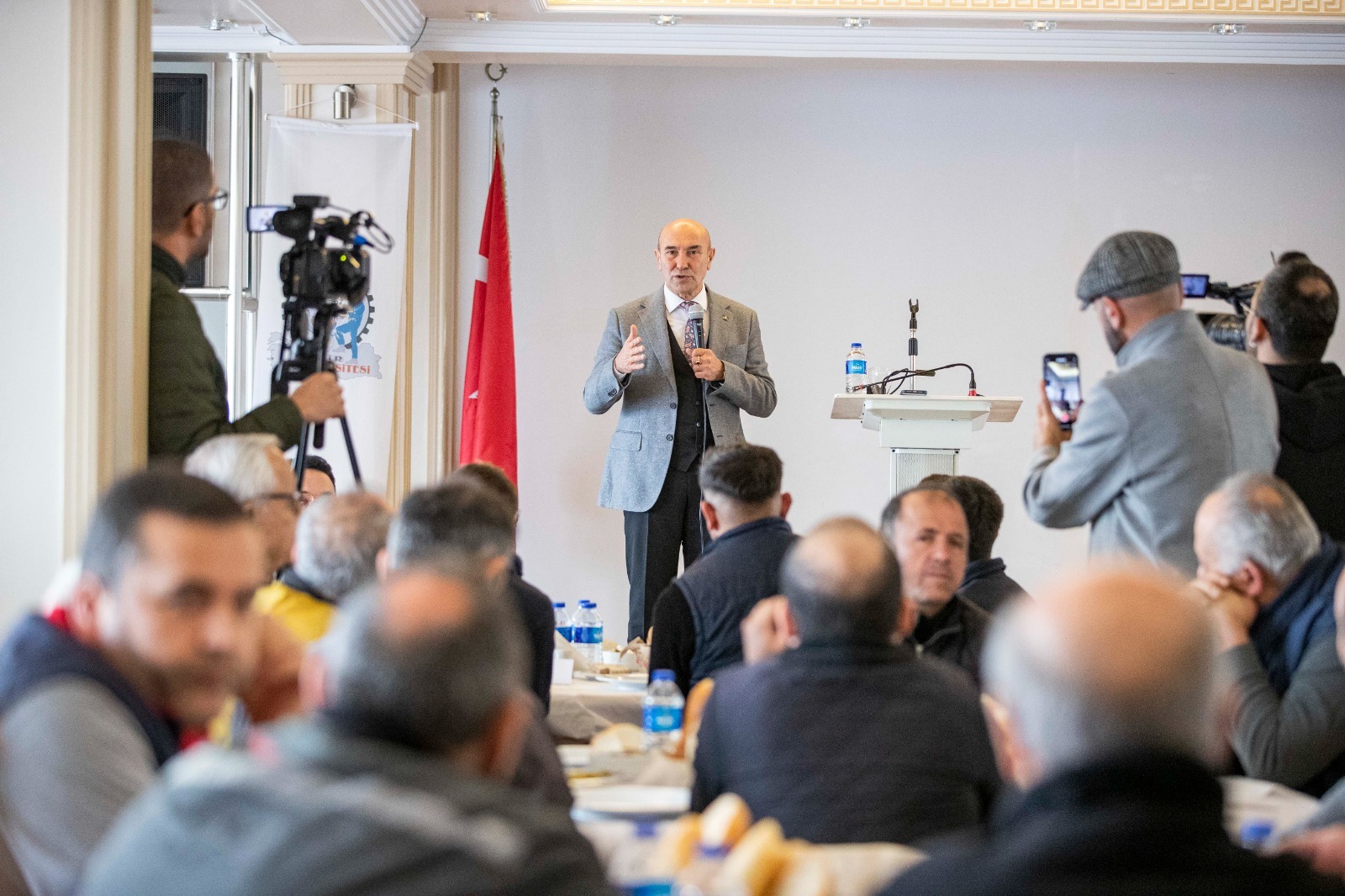 İzmir Büyükşehir Belediye Başkanı Tunç Soyer, 3. Sanayi Sitesi İşletme Kooperatifi'nin geleneksel kuru fasulye buluşmasına katıldı. Esnaf ve işçilerle yemek yiyen Başkan Tunç Soyer, “Kentsel dönüşümü, sanayi dönüşümü olarak ilk defa burada uygulayacağız. Göreceksiniz modern bir sanayi sitesini hep birlikte kuracağız.” dedi.