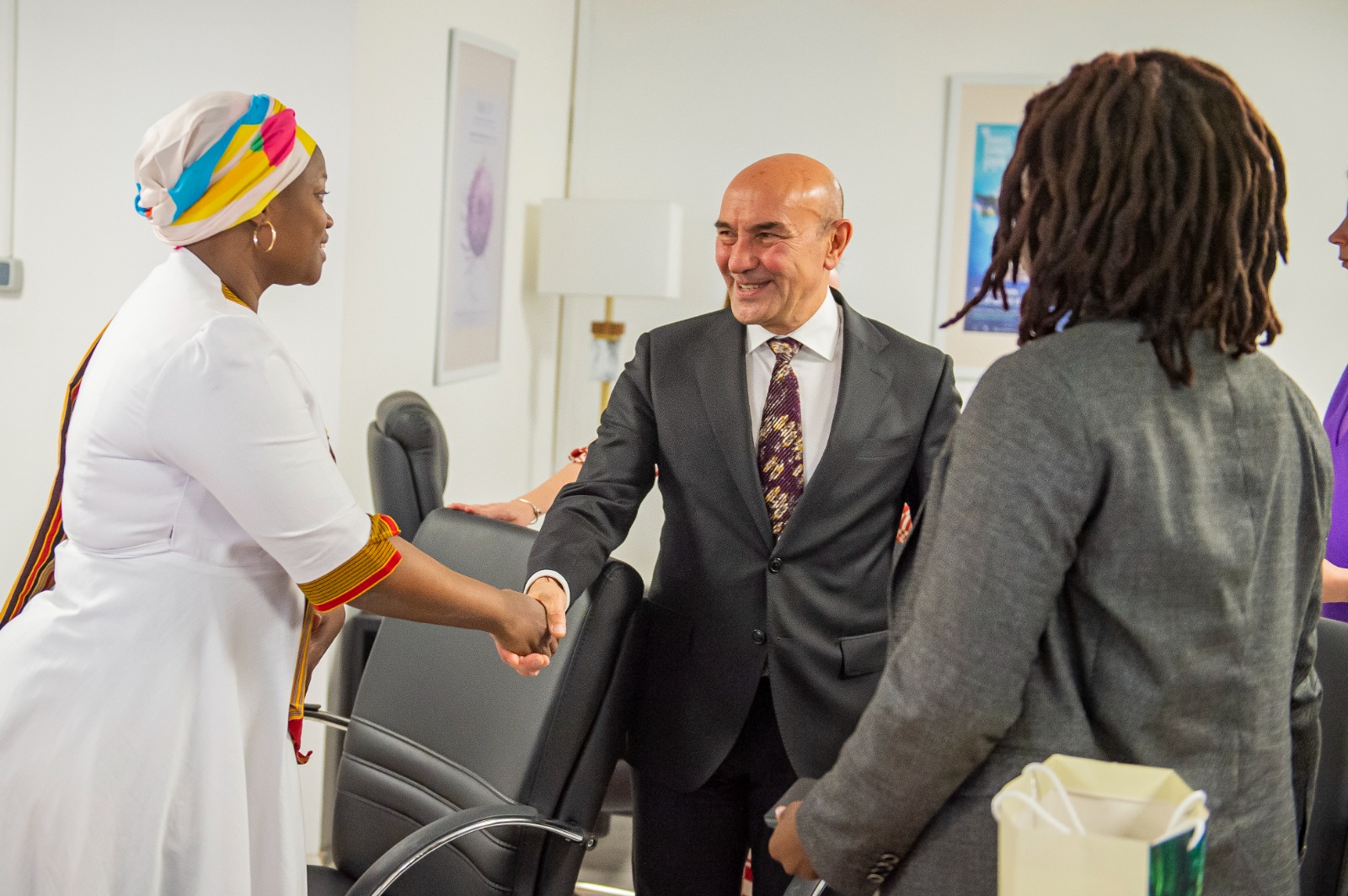 İzmir Büyükşehir Belediye Başkanı Tunç Soyer, Uganda’nın Ankara Büyükelçisi Nusura Tiperu'yu ağırladı. Fuar İzmir’deki görüşmede iki ülke arasındaki ticari, ekonomik ve kültürel ilişkilerin geliştirilmesi için atılması gereken adımlar konuşuldu.