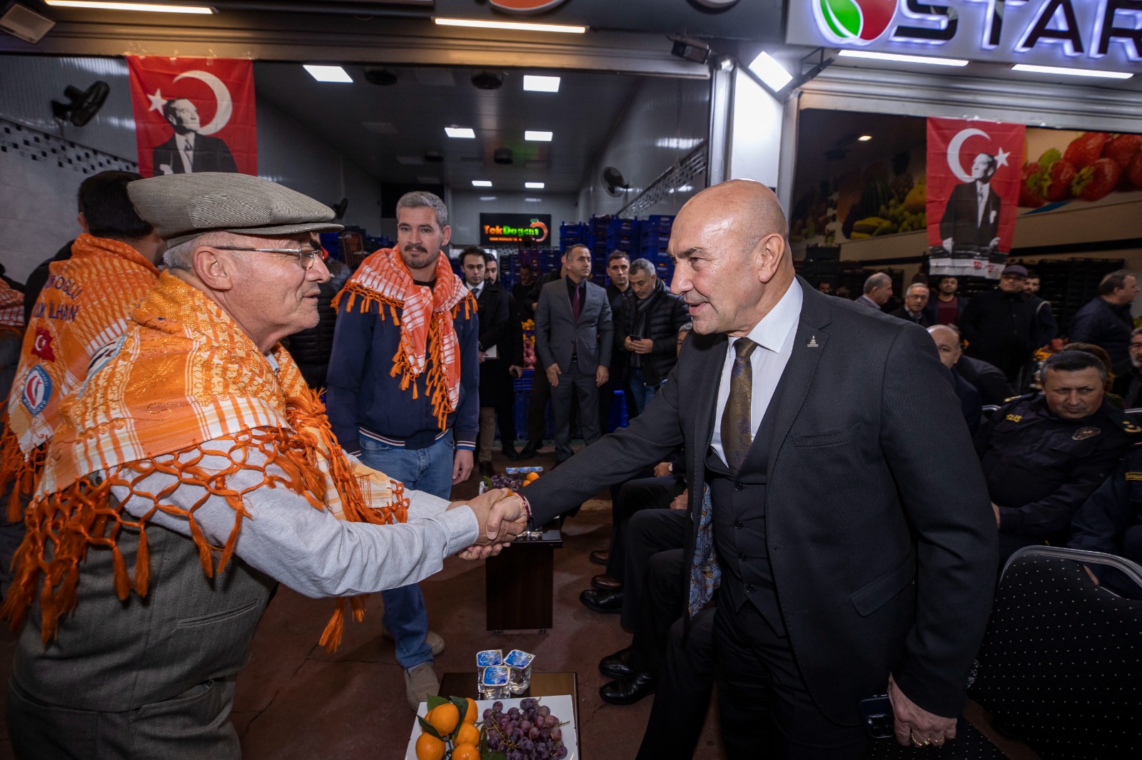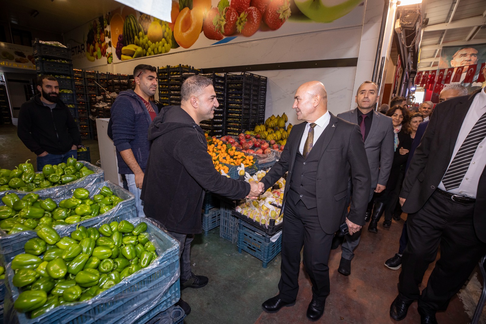 Etkinlik öncesi hal esnafını ziyaret eden Başkan Tunç Soyer, konuşmasında Türkiye’deki tarım politikalarından söz ederek “Türkiye, daha 50-60 yıl öncesine kadar, kendi kendine yetebilen, dahası etrafındaki ülkeleri de doyurabilen bir tarım ülkesi, bir tahıl ambarı oldu. Benim yaşlarımda olan herkesin, özellikle de yerli malı haftasında öğretmenlerinden duyduğu bu sözler, yazık ki artık geçmişte kaldı. Bir de Hakkâri’den Edirne’ye her ilin bitkisel ve hayvansal ürünlerinin yer aldığı bir Türkiye Haritası vardı. O da kayboldu. 50-60 sene içinde çok şey kaybettik. Ülkemizi postallarla işgal edemeyenler, zehirli tohumlarıyla ve kimyasallarıyla işgal ettiler. En büyük darbe, hiç kuşkusuz bir gecede 16 bin köyün kapatılması ile gerçekleşti. Tarım geleneğini sürdüren aile çiftçiliği, büyük şirketlere kurban edildi. Bereketli topraklarımız ve meralarımız yavaş yavaş yok edildi. Düşünün, anavatanı Anadolu olan buğdayı, bir zamanlar ambarı olduğumuz tahıl ürünlerini üretmek yerine dışarıdan ithal eder konuma geldik. Bu bizim için çok acı bir tablo” ifadelerini kullandı.