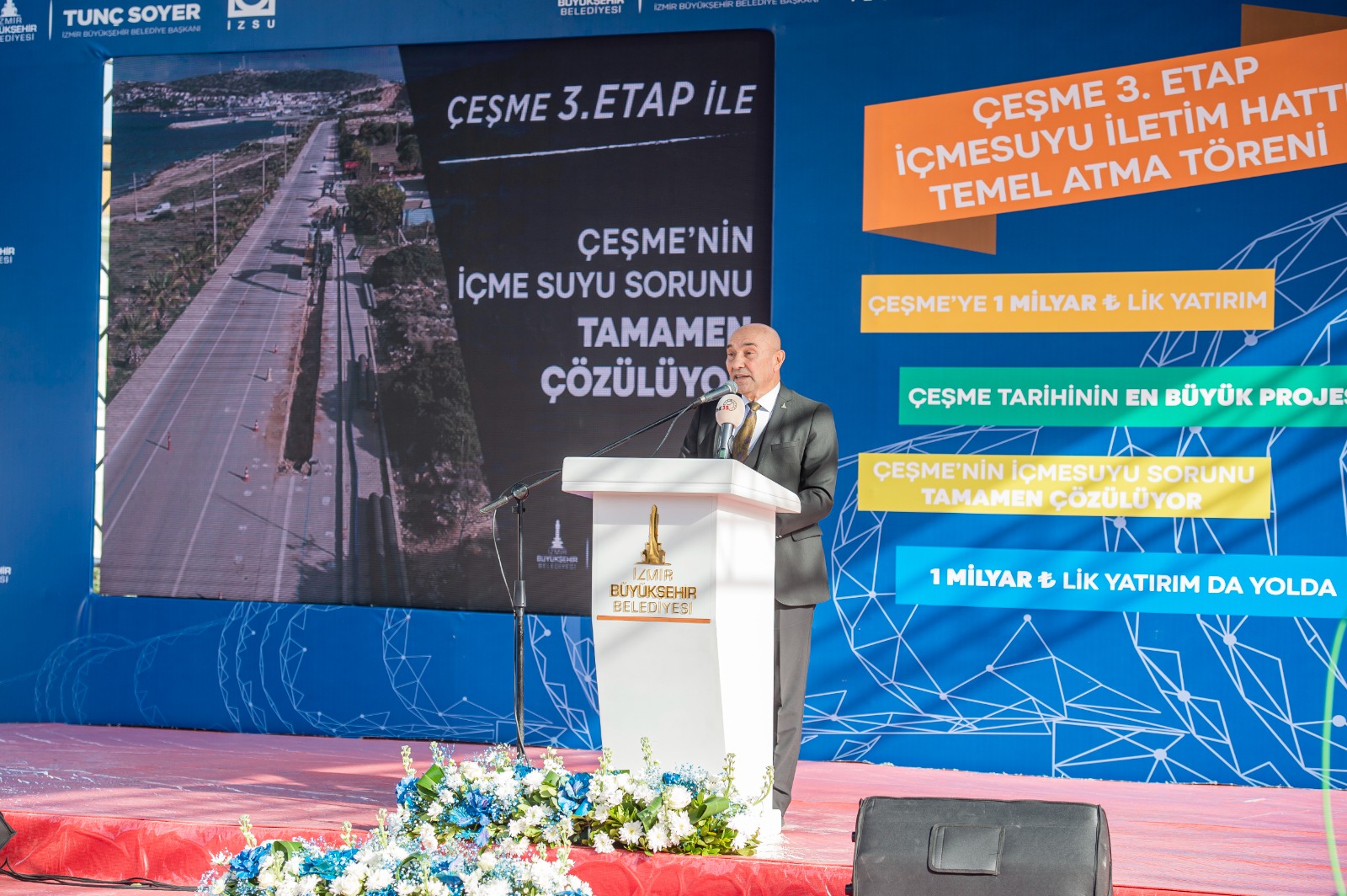 Dünyaca ünlü turizm merkezi Çeşme’nin içme suyu altyapısını baştan sona yenilemek üzere tarihi yatırıma imza atan İZSU Genel Müdürlüğü, projenin üçüncü etabının temelini de attı. İzmir Büyükşehir Belediyesi’nin Çeşme’nin içme suyu, altyapı ve arıtma hizmetleri için yaptığı yatırım miktarının 1 milyar lirayı aştığını söyleyen Başkan Tunç Soyer, “Bugünü kurtarmak değil, geleceği inşa etmekte kararlıyız. Yarımada’da, kent merkezinde ve İzmir’in tüm ilçelerinde çağın koşullarına uygun sağlıklı ve dirençli bir kent yaşamını, yani İzmir’in geleceğini inşa ediyoruz” dedi.