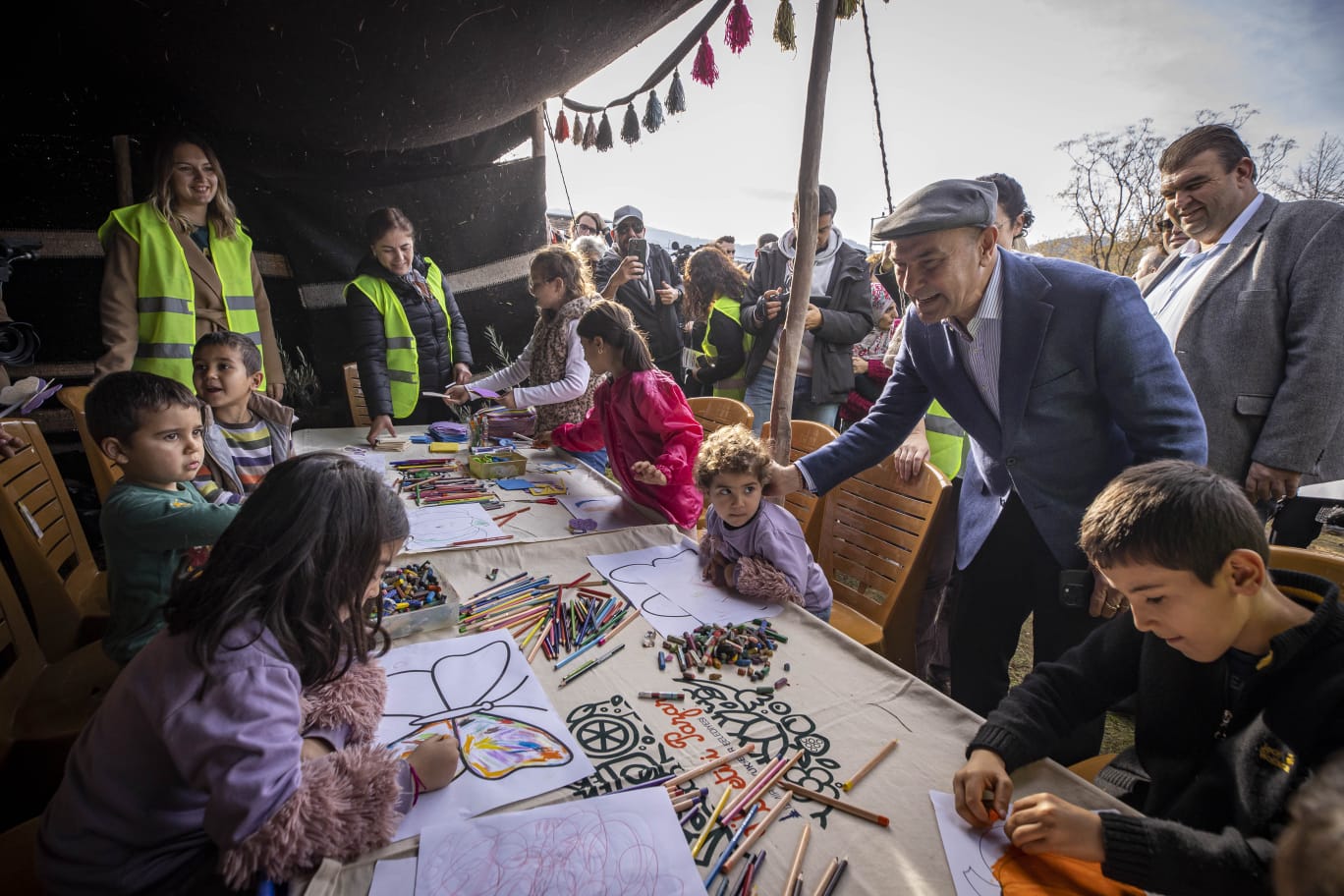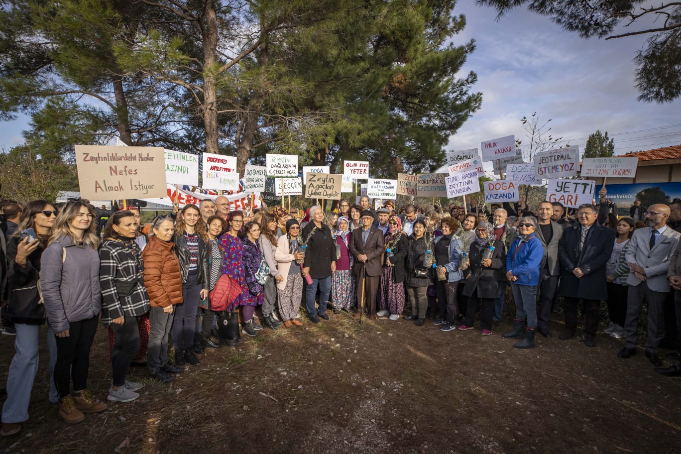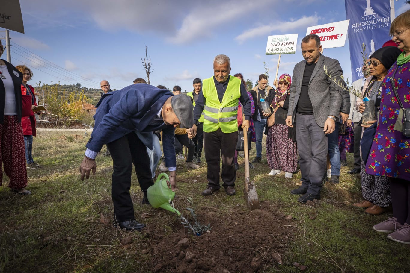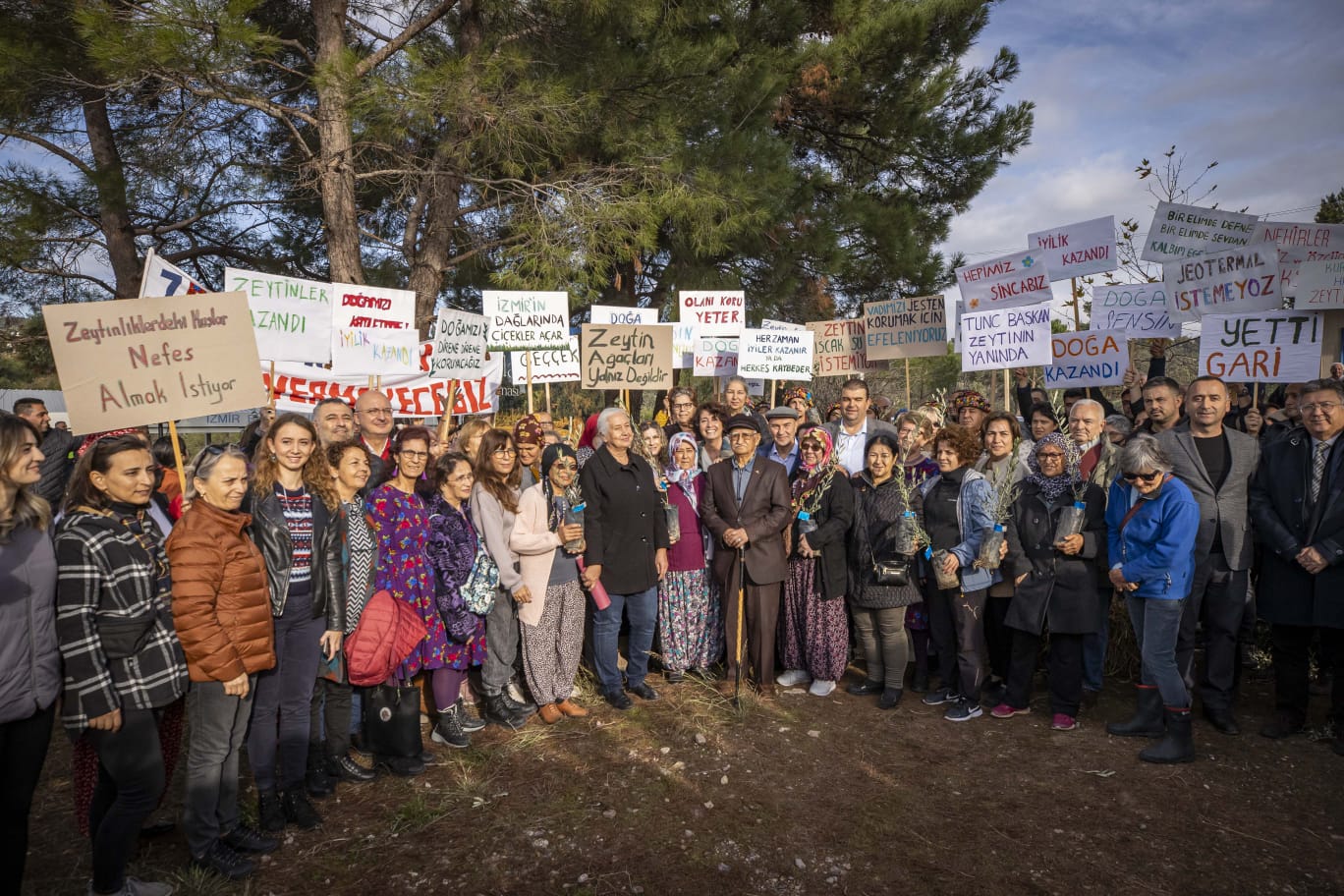 Başkan Tunç Soyer’i alanda “Yetti gari”, “Zeytin Ağaçları Yalnız Değildir”, “Tarım Alanlarımızın Yok Olmasına İzin Vermeyeceğiz”, “Zeytinliklerdeki Kuşlar Nefes Almak İstiyor” yazılı dövizler karşıladı. Törende konuşan Başkan Soyer, “Zeytin fidanı dağıtımına başlarken amacımız aslında meclise intikal eden ‘Zeytinliklerin Madene Açılması’yla ilgili yasa tasarısının iptalini dillendirmek, onunla mücadele etmekti. Çok şükür geri adım attılar yine vazgeçtiler. Bunun heyecanını yine beraber paylaşalım. Onlar defalarca deniyorlar. ‘Acaba direnç görmezsek bu defa başarır mıyız?’, ‘Direnç görmezsek zeytinlikler madene açılır mı?’ diye uğraşıp duruyorlar. Biz buna izin vermeyeceğiz” dedi.
