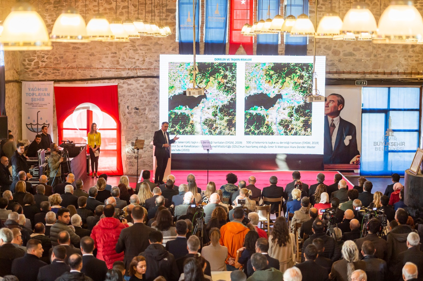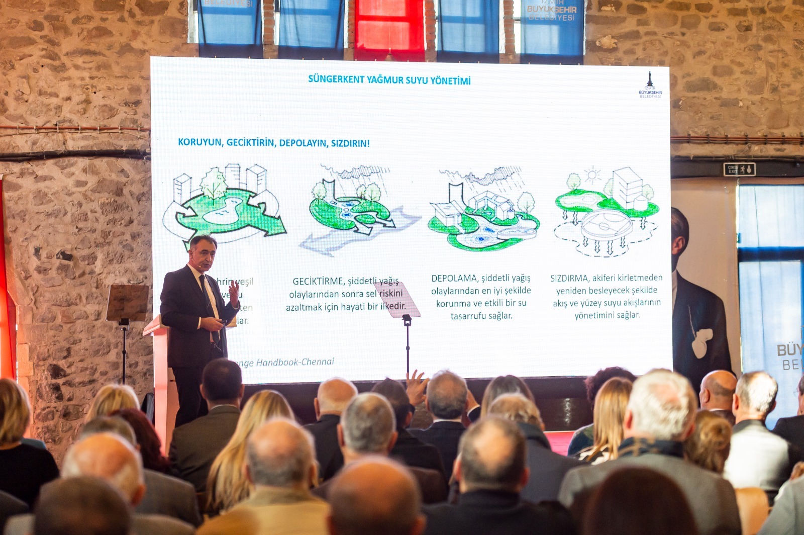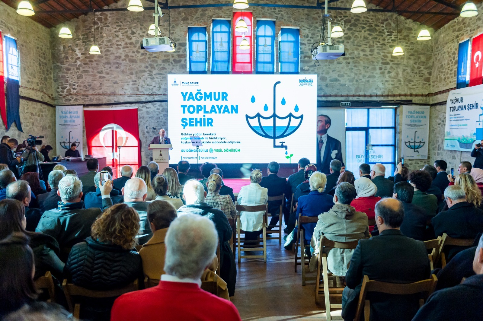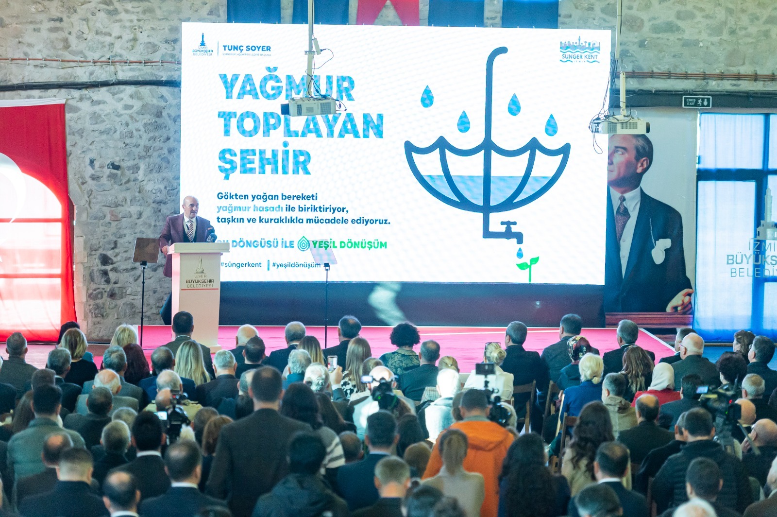 İzmir Büyükşehir Belediye Başkanı Tunç Soyer’in “Başka Bir Su Yönetimi Mümkün” vizyonuyla hayata geçirilen Sünger Kent İzmir projesinin tanıtım toplantısı Tarihi Havagazı Fabrikası Gençlik Yerleşkesi’nde yapıldı. Türkiye’de bir ilk olacak projeyle şehrin caddelerine, sokaklarına, yollarına düşen yağmur suyunun bilimsel uygulamalarla yer altında depolanmasını sağlayacak. Çatılara düşen yağmur suyunun ise hasat edilerek biriktirilmesi, temizlenmesi ve yeniden kullanılmasını mümkün kılacak proje Başkan Tunç Soyer tarafından kamuoyuna tanıtıldı.