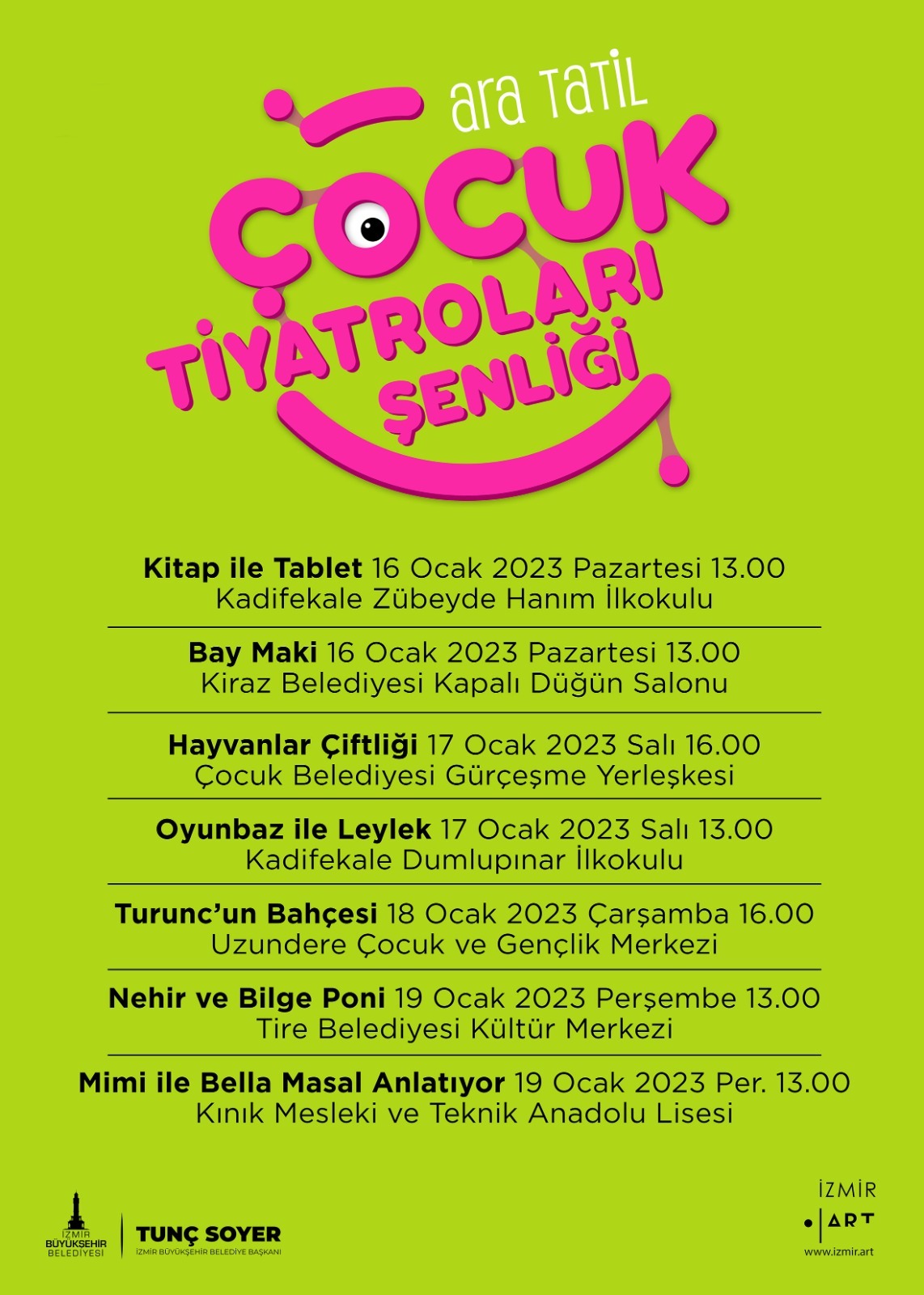 16 – 19 Ocak tarihleri arasında 7 farklı ilçede 7 farklı oyunun ücretsiz olarak çocuk izleyicilerle buluşacağı şenlik programına ve detaylara http://kultursanat.izmir.bel.tr/ ve www.izmir.art adreslerinden ulaşılabilir.