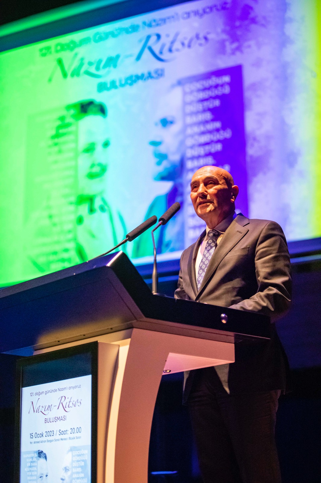 Anma programında konuşan Başkan Tunç Soyer, Nazım ve Ritsos’un barışı ve hakça yaşamı savundukları için ömürlerinin sürgün ve hapislerde geçtiğini söyledi. Nazım Hikmet'in kitaplarının yasaklandığını, hatta yakıldığını anımsatan Başkan Tunç Soyer, “Fakat onlar asla korkmadı, vazgeçmedi. Aksine seslerini daha gür, daha güçlü çıkardılar. Omuz omuza verdiler ve yeryüzündeki bütün haksızlıklara karşı adaletin ete kemiğe bürünen hali oldular. Şiirleriyle, sözleriyle, sevdalarıyla… Bize şu dünyadaki en değerli mirası bıraktılar: Barış” dedi.