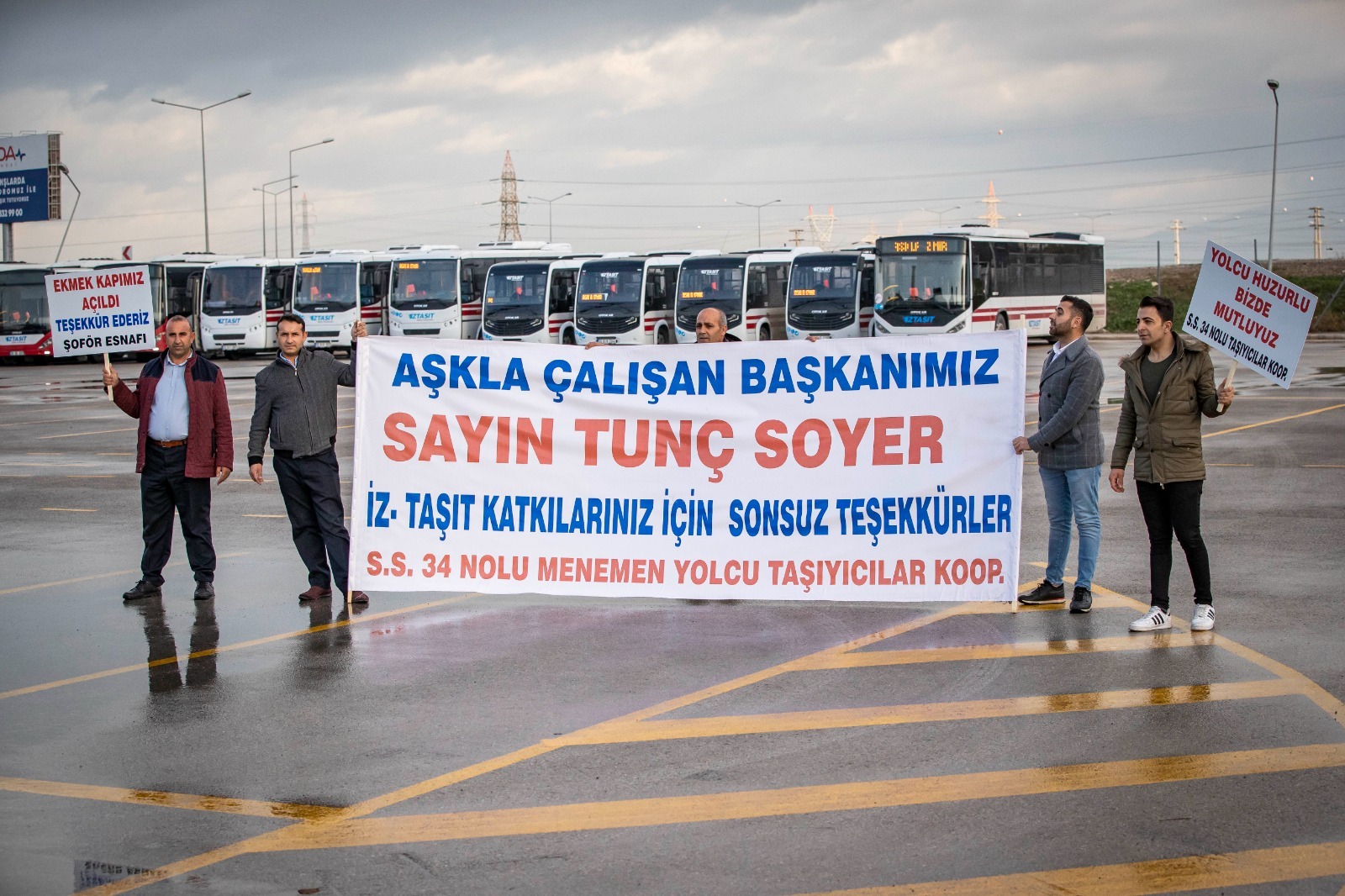 Başkan Soyer garajda şoförlerin çiçek ve pankartlarıyla karşılandı. Başkan Soyer’e, CHP Menemen İlçe Başkanı Ömer Güney, İzmir Büyükşehir Belediyesi Genel Sekreteri Barış Karcı, ESHOT Genel Müdürü Erhan Bey, kooperatif başkanları, meclis üyeleri ve muhtarlar eşlik etti.