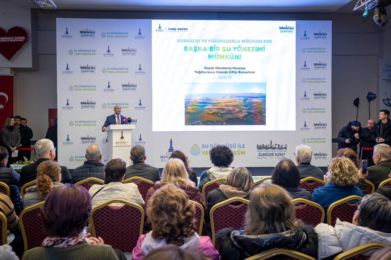 İzmir Büyükşehir Belediyesi Başkan Danışmanı, jeoloji mühendisi Alim Murathan ise Küçük Menderes Havzası Yağmur Suyu Hasadı Projesi ile ilgili teknik sunum yaptı. Alim Murathan, yağmur suyu hasadı ile ova üzerine düşen yağmur suyunun buharlaşmadan yeraltında depolanmasını ve yeraltı sularının tekrar doldurulmasını amaçladıklarını söyledi. Proje ile yeraltı su seviyelerinde önemli yükselimler sağlanacağını ifade eden Murathan, çiftçi ve üreticilerin enerji maliyetlerinin düşürülerek milyonlarca lira tasarruf sağlanacağını söyledi.