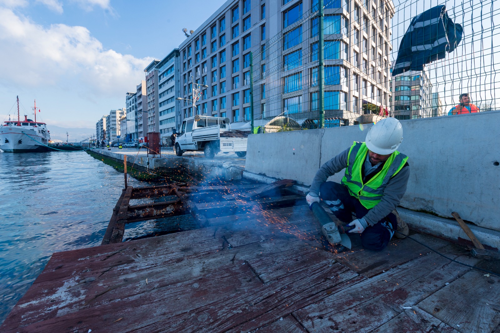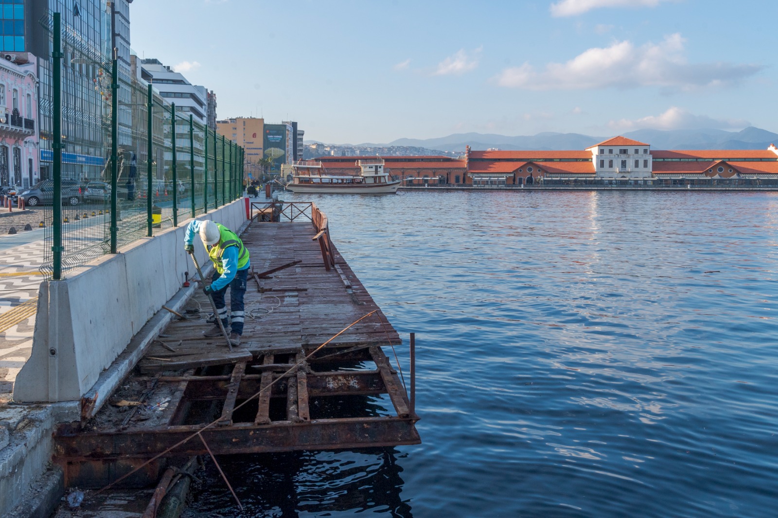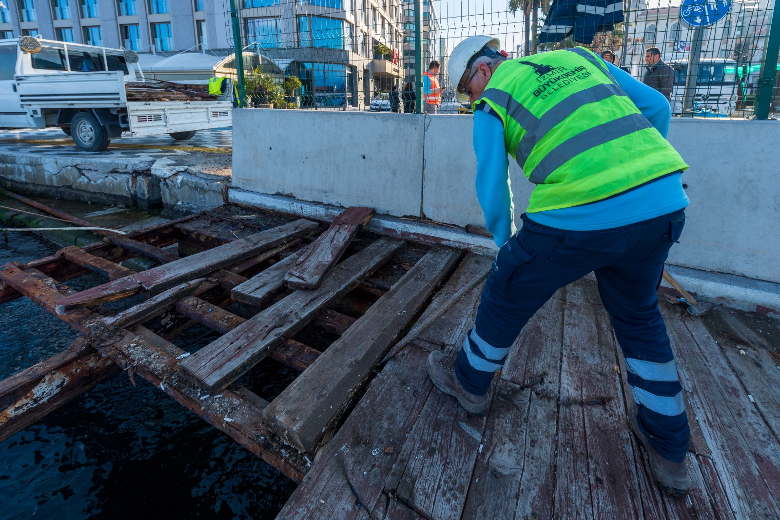 İzmir Büyükşehir Belediyesi, deniz suyunun etkisiyle çürüyerek yurttaşların can ve mal güvenliğini riske atan Konak Pier ve Pasaport Vapur İskelesi arasındaki üç seyir terasının sökümünü başlattı.