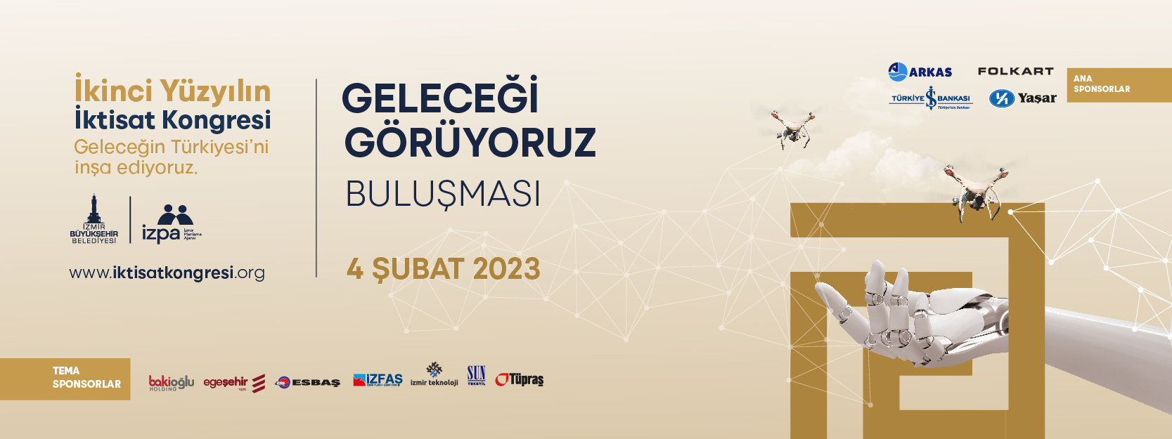 İzmir Büyükşehir Belediyesi tarafından 15-21 Şubat 2023 tarihleri arasında “Geleceğin Türkiyesi’ni inşa ediyoruz” sloganıyla düzenlenecek İkinci Yüzyılın İktisat Kongresi’nin yedi aydır süren hazırlık toplantılarında sona gelindi. 10 Ağustos ve 1 Aralık 2022 tarihleri arasında düzenlenen ve kongrenin ilk safhasını oluşturan paydaş buluşmalarının ardından kongre çalışmalarında ikinci aşama uzman toplantıları, “Geleceği Görüyoruz” buluşması ile sonlanacak. “Geleceği Görüyoruz” toplantısı, yarın (4 Şubat) İzmir’deki İzQ Girişimcilik Merkezi’nde düzenlenecek.