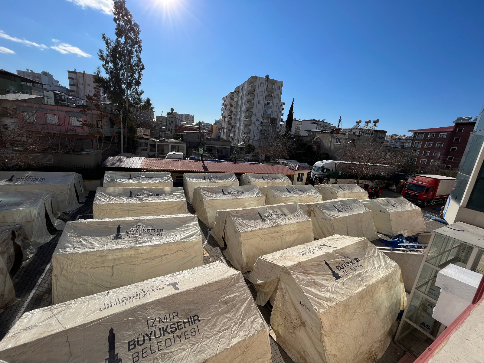 Merkez üssü Kahramanmaraş olan büyük deprem sonrasında harekete geçen İzmir Büyükşehir Belediyesi’nin itfaiye ekipleri, felaketten etkilenen Osmaniye, Hatay, Gaziantep, Malatya, Adıyaman, Adana, Kilis, Diyarbakır, Elazığ ve Şanlıurfa’da destek çalışmalarını sürdürüyor. Osmaniye’de 100 personel ile arama kurtarma çalışmalarına devam eden Büyükşehir Belediyesi ekipleri, evlerine giremeyen depremzedeler için çadır alanı da oluşturdu. Fuar İzmir'den yola çıkan yardımlar ise Osmaniye'ye ulaştı.