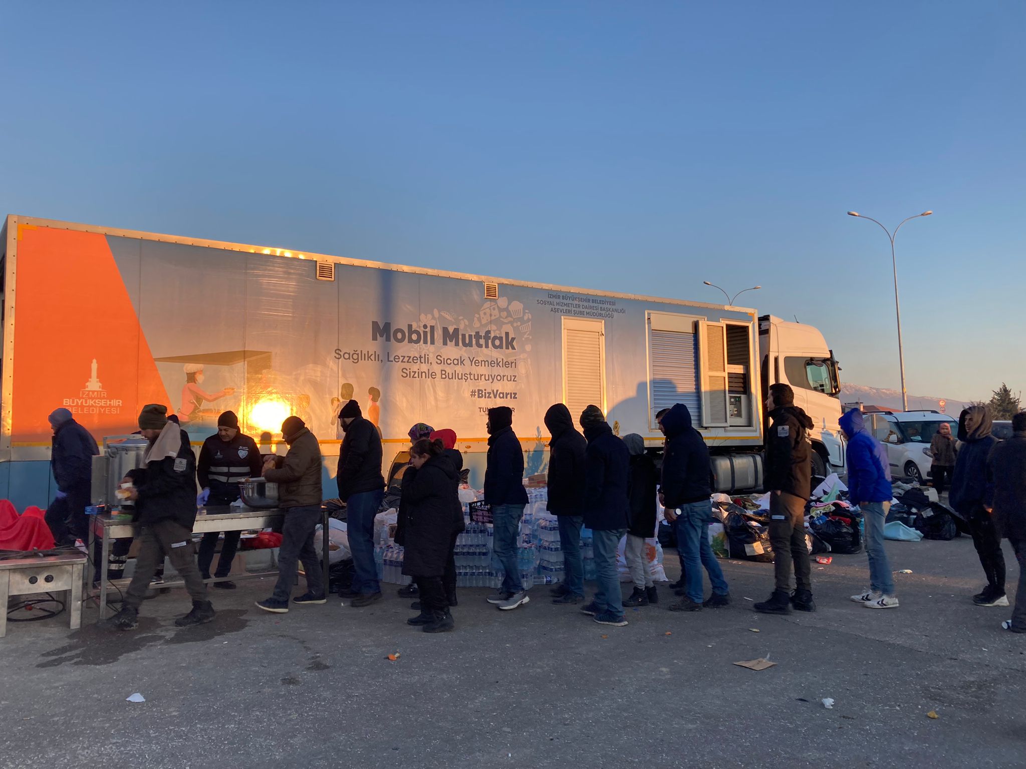 İzmir Büyükşehir Belediyesi’nin arama kurtarma ekipleri sahada çalışmalarını sürdürüyor. Günlük 9 bin öğün sıcak yemek üreten mobil mutfak da hizmete girdi.