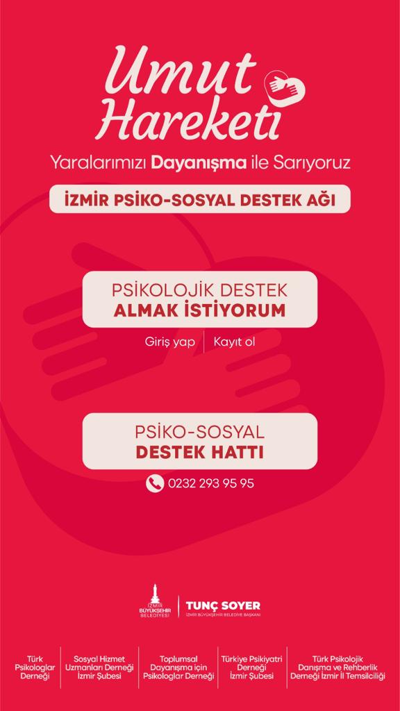 Depremden etkilenen yurttaşlar destek sağlayabilmek amacıyla oluşturulan “Psikososyal Destek Hattı”na (0232) 293 95 95 numaralı telefondan ulaşılabilir.