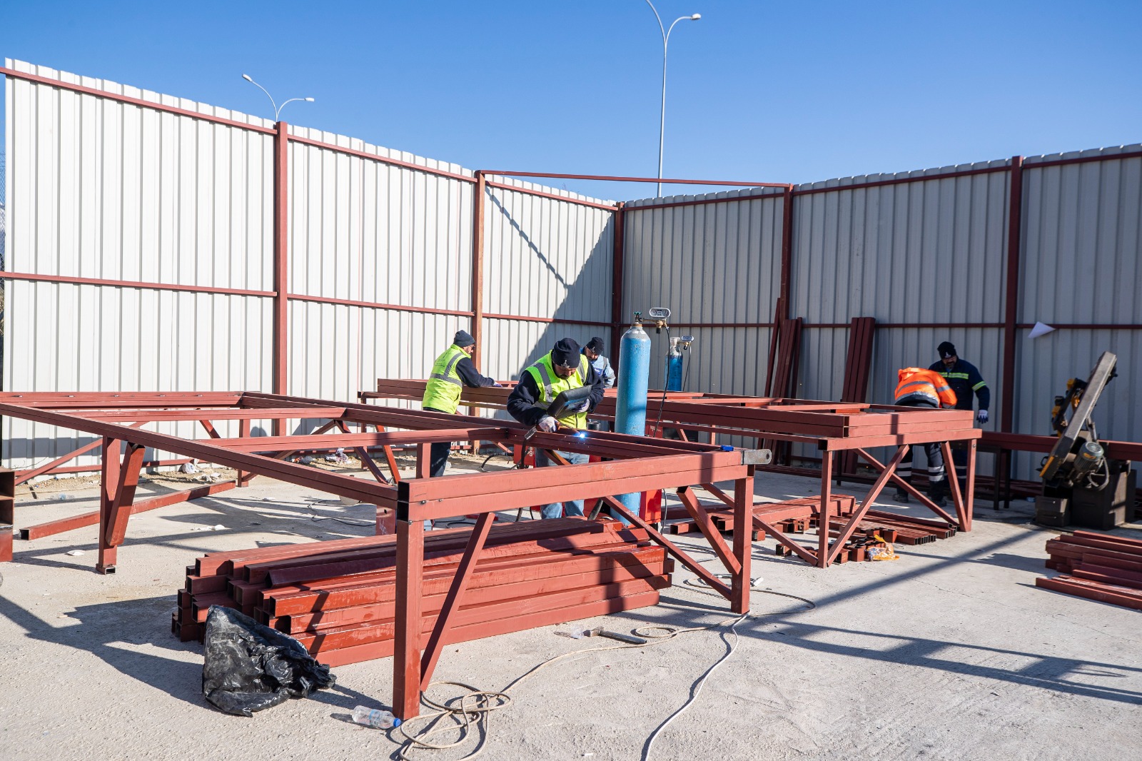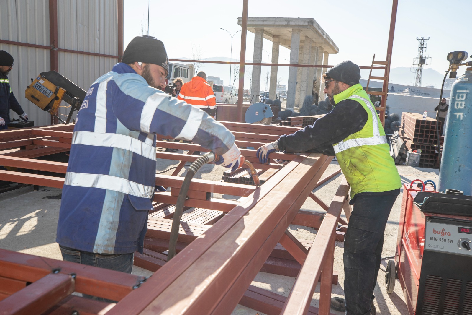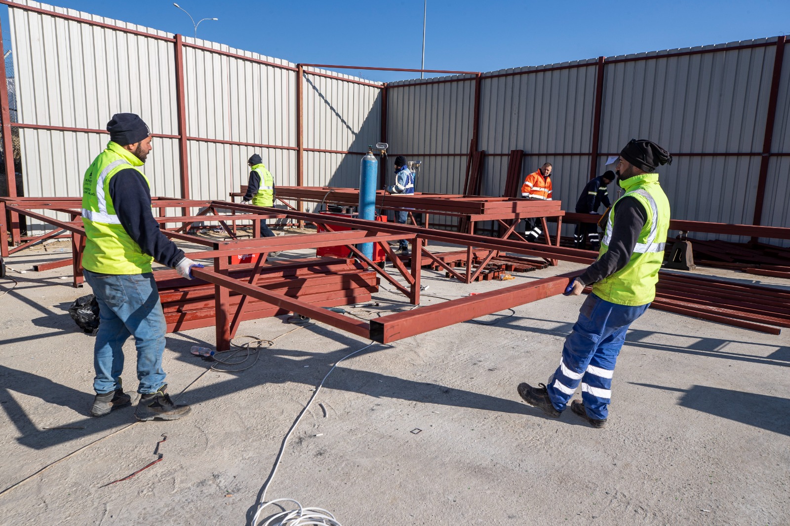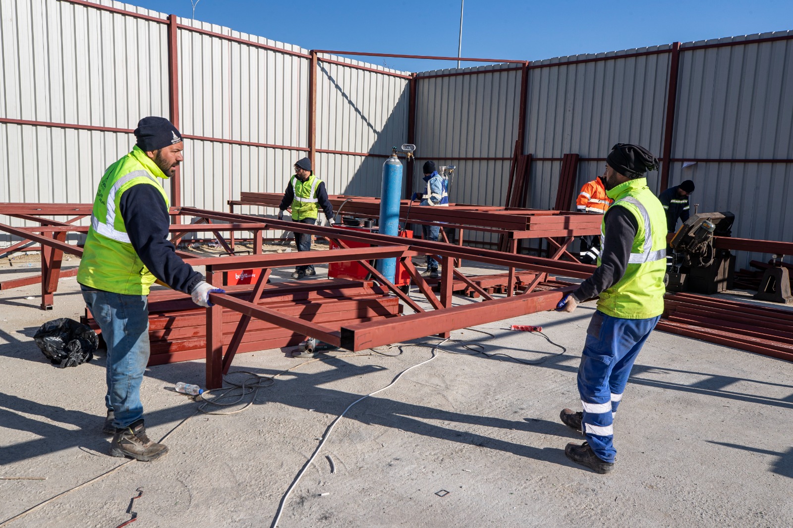 Çalışmalar hakkında bilgi veren İzmir Büyükşehir Belediyesi Genel Sekreter Yardımcısı Ertuğrul Tugay, “Burada bir konteyner kent kurmak için yer belirleme sürecimiz oldu. AFAD’dan yer tahsisi için bilgi bekliyoruz. Biz bu süreçte daha hızlı yol alabilmek adına İzmir Büyükşehir Belediyesi’nin fen işleri ekipleriyle burada konteyner üretmeye başladık. Bir atölye kurduk. Karkas yapılarını oluşturuyoruz, götürdüğümüzde de hemen panelvanlarla kapatarak vatandaşlarımızın kullanımına açacağız. Depremzedelerimizin kışı daha sağlıklı bir ortamda geçirmelerine fırsat yaratmış olacağız. Şu an Hatay için 500 konteyner hazırlamayı planlıyoruz.” diye konuştu.