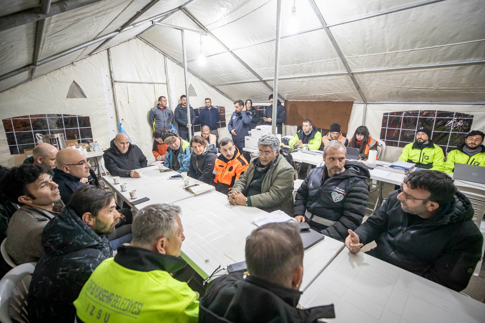 Türkiye'yi sarsan deprem felaketinin ardından tüm birimleriyle afet bölgesinde çalışmalarını sürdüren İzmir Büyükşehir Belediyesi'nin Adıyaman, Kahramanmaraş, Osmaniye ve Hatay'da kuracağı koordinasyon merkezlerinden ilki Hatay'da EXPO yolu üzerinde hizmet vermeye başladı. İzmir Büyükşehir Belediye Başkanı Tunç Soyer, dün akşam saatlerinde Hatay Koordinasyon Merkezi'ne gelerek İZSU, İtfaiye, Fen İşleri, Zabıta, Sosyal Hizmetler, Mezarlıklar, Sosyal Projeler, Eşrefpaşa Hastanesi başta olmak üzere alanda görevli ekiple toplantı yaptı. Toplantının ardından Başkan Soyer, çadır kent alanını ziyaret ederek depremzedelerin ihtiyaçlarını sordu, sohbet etti. Çadır alanında kurulan birimleri gezen Başkan Soyer, fen işleri şantiyesi, lojistik merkez, sahra hastanesi ve itfaiye koordinasyon merkezindeki çalışmaları inceledi.