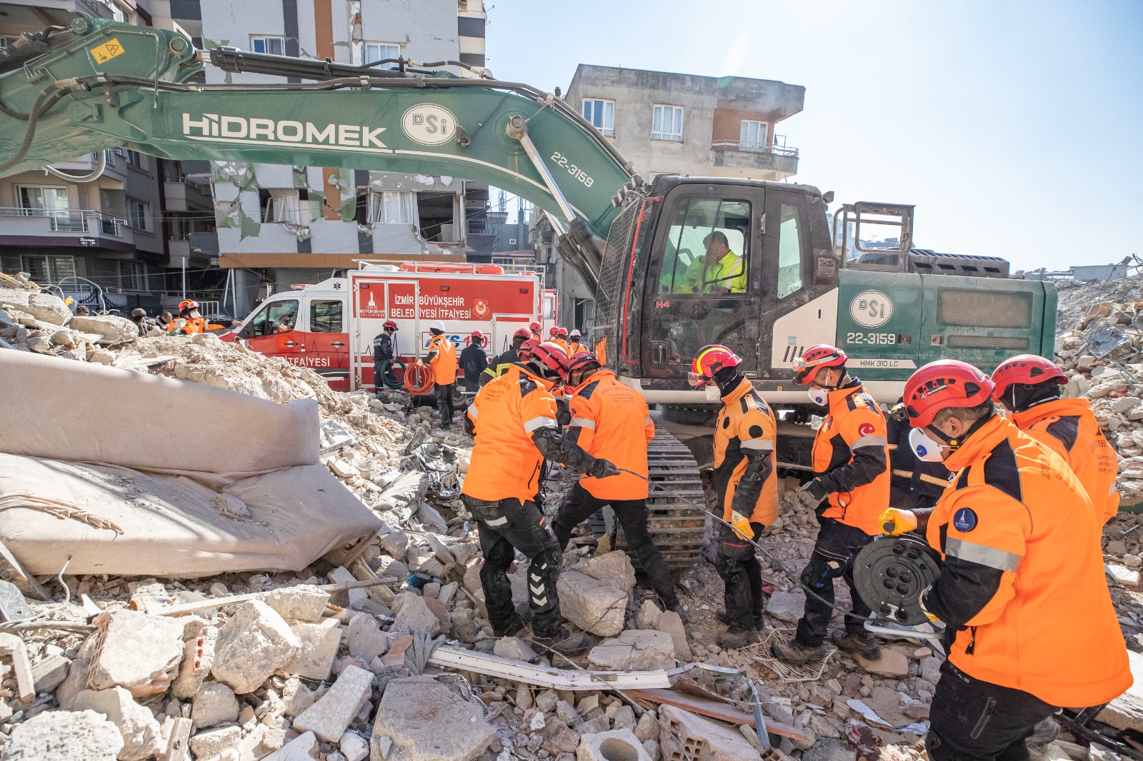 İzmir İtfaiye Dairesi Başkanı İsmail Derse, “Depremin ilk anında 112 merkezinden aldığımız bilgiyle hemen hazırlıklarımızı başlattık. İlk aşamada 8 araç ve 40 kişilik personel grubuyla yola çıktık. Osmaniye ve Hatay’da 6 yurttaşımızı sağ olarak çıkardık” dedi. İlk önce Osmaniye’ye gittiklerini belirten İsmail Derse “Osmaniye’de yaklaşık 3 gün çalıştık. Aynı günün sabahı diğer ekibimizin de Osmaniye’ye gelmesiyle 146 kişiye ulaştık. Ardından Hatay’a geçtik. Osmaniye ve Hatay’da maalesef 77 cenazeyi de enkaz altından çıkardık” diye konuştu.