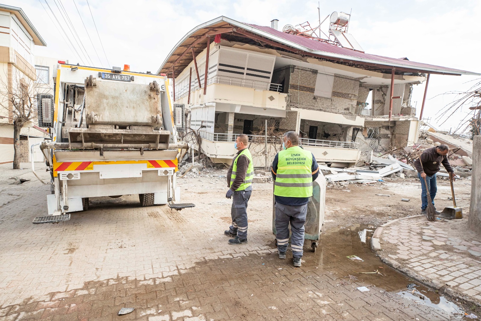 İzmir Büyükşehir Belediyesi’nin Kahramanmaraş’taki Afet Koordinasyon Birimi, temizlik işleri ekipleriyle yıkımın yaşandığı yerleşimlerde her gün 8 tonun üzerinde çöp topluyor.