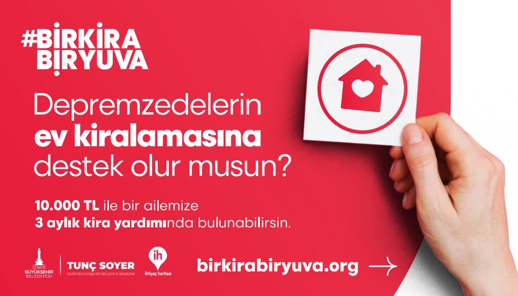 11 ilde büyük yıkıma neden olan deprem felaketi sonrasında barınma sorununa çözüm bulmak için İhtiyaç Haritası ile “Bir Kira Bir Yuva” kampanyasını başlatan İzmir Büyükşehir Belediyesi, dayanışmayı büyütüyor. Kira yardımı yapmak veya boş durumdaki evini depremzedelere açmak isteyenleri, barınacak eve ihtiyacı olanları birkirabiryuva.org sitesi üzerihden buluşturan kampanya için bu kez ekran başından Türkiye’ye ve dünyaya çağrıda bulunulacak.