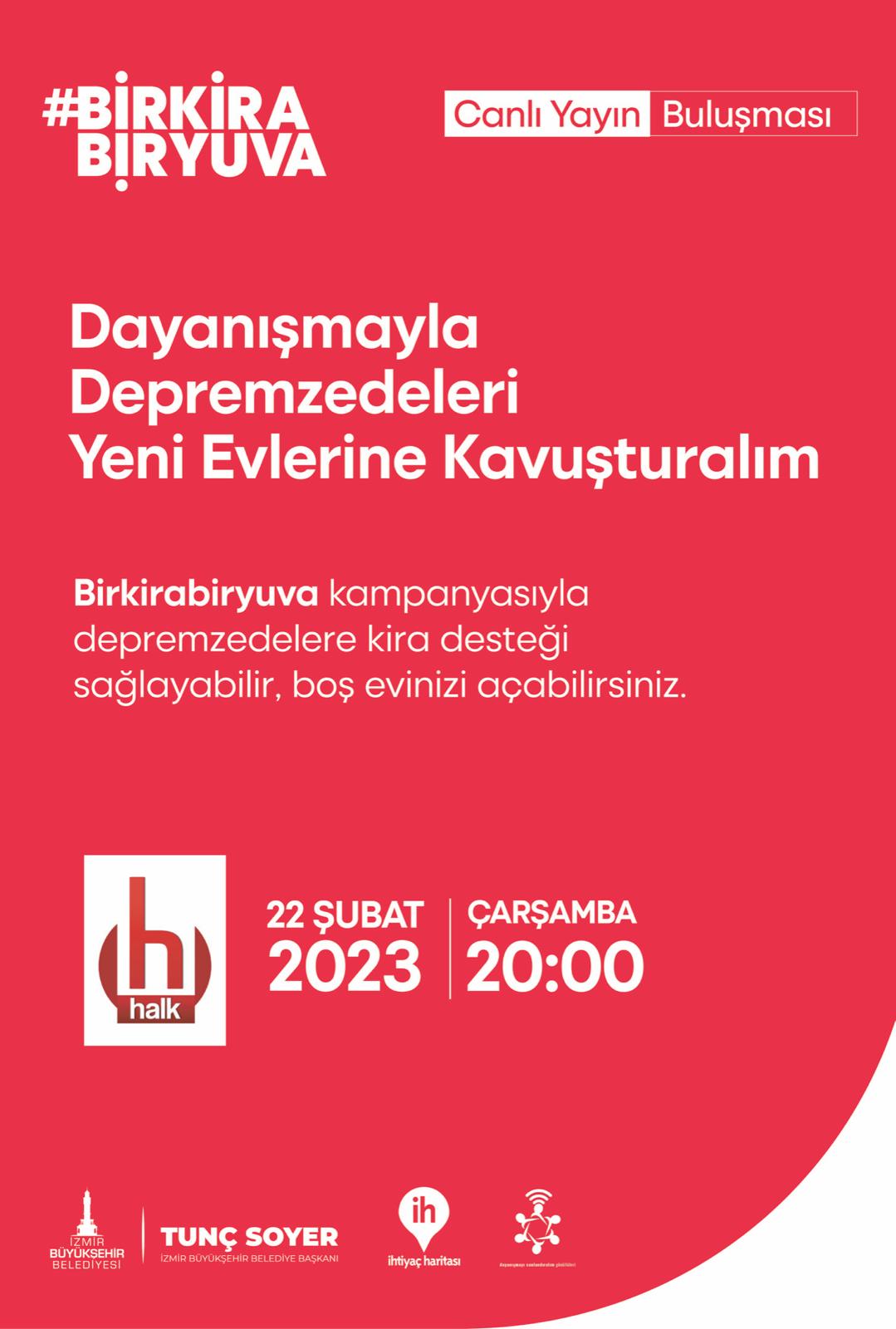 22 Şubat Çarşamba günü Halk TV ekranından yapılacak özel yayınla milyonlarca depremzede için yeni bir umut kapısı aralanacak. İzmir Büyükşehir Belediyesi ve İhtiyaç Haritası işbirliğiyle yürütülen “Bir Kira Bir Yuva” kampanyasını daha geniş kitlelere ulaştırmak amacıyla düzenlenecek özel gecede toplanacak bağışlarla depremzedelerin barınma sorununun çözümüne katkı sağlanması hedefleniyor. İzmir Büyükşehir Belediye Başkanı Tunç Soyer, “Dayanışmayı büyütmek bizlerin elinde, gelin hepimiz gücümüzü birleştirelim. Depremzede vatandaşlarımıza kucak açalım” dedi.