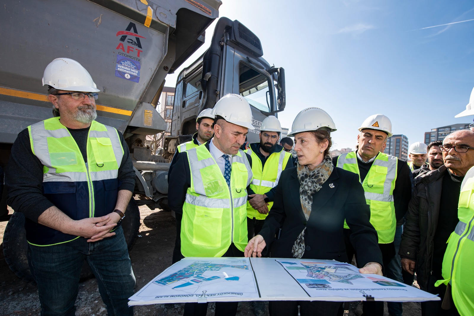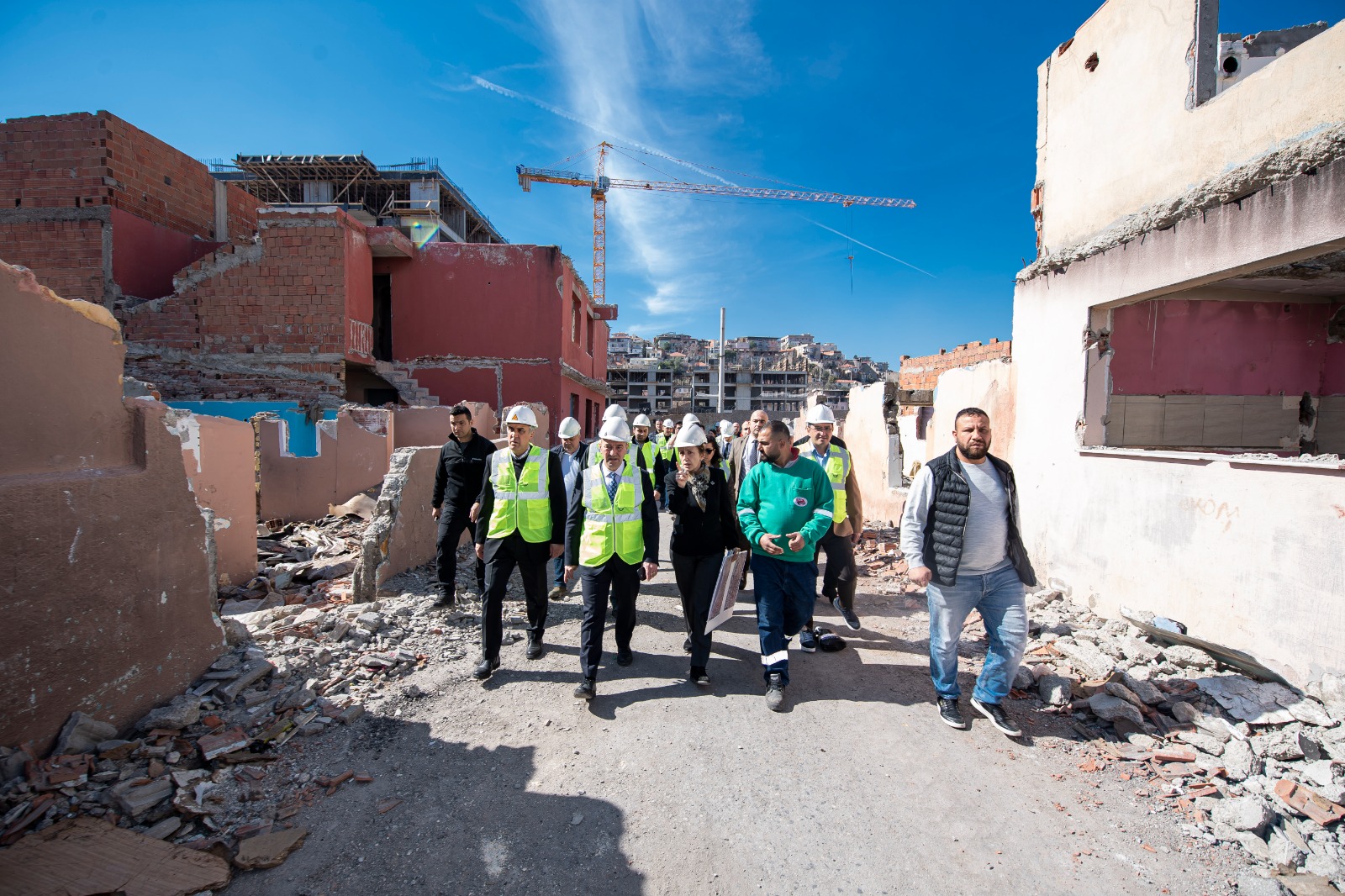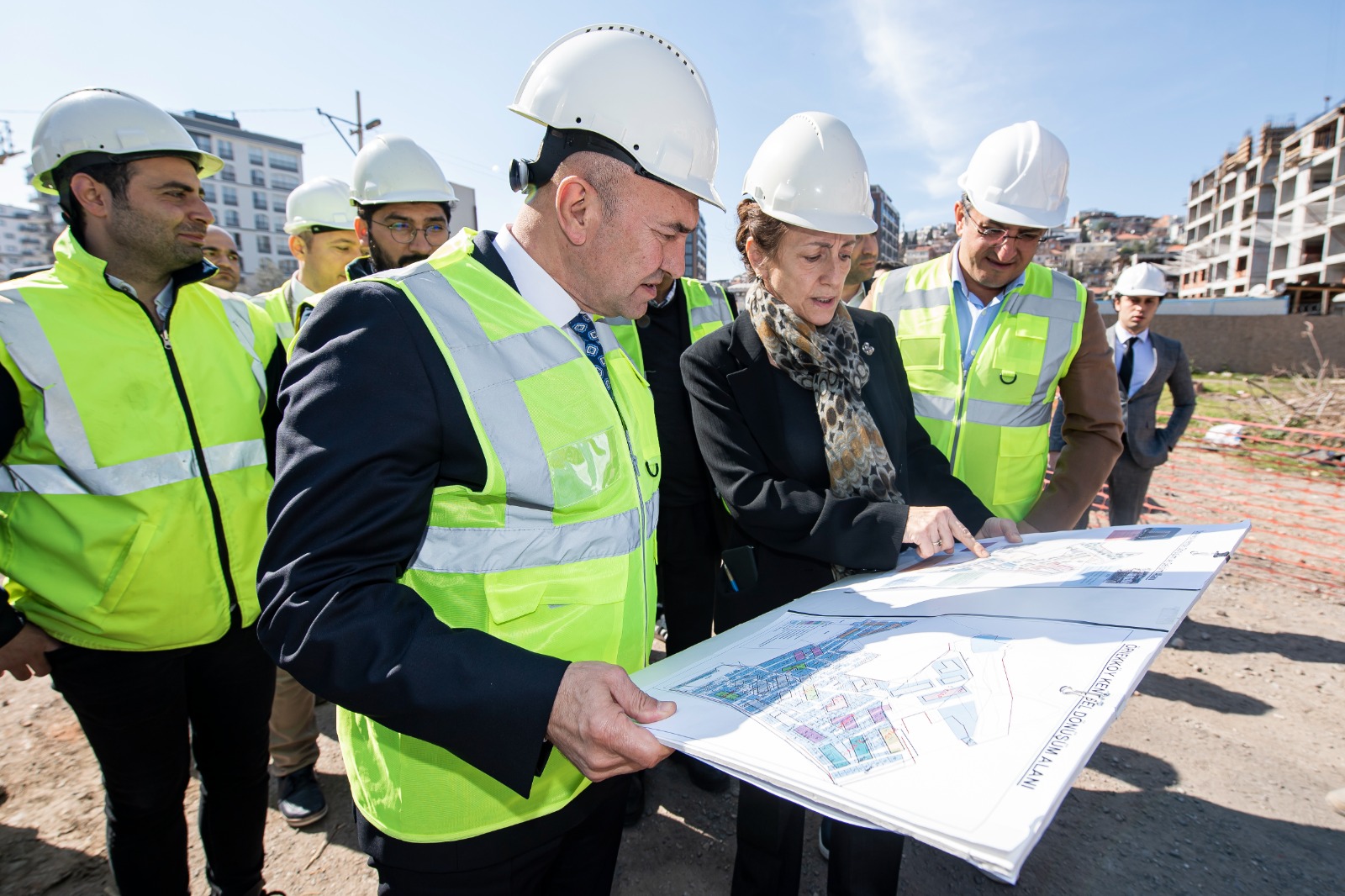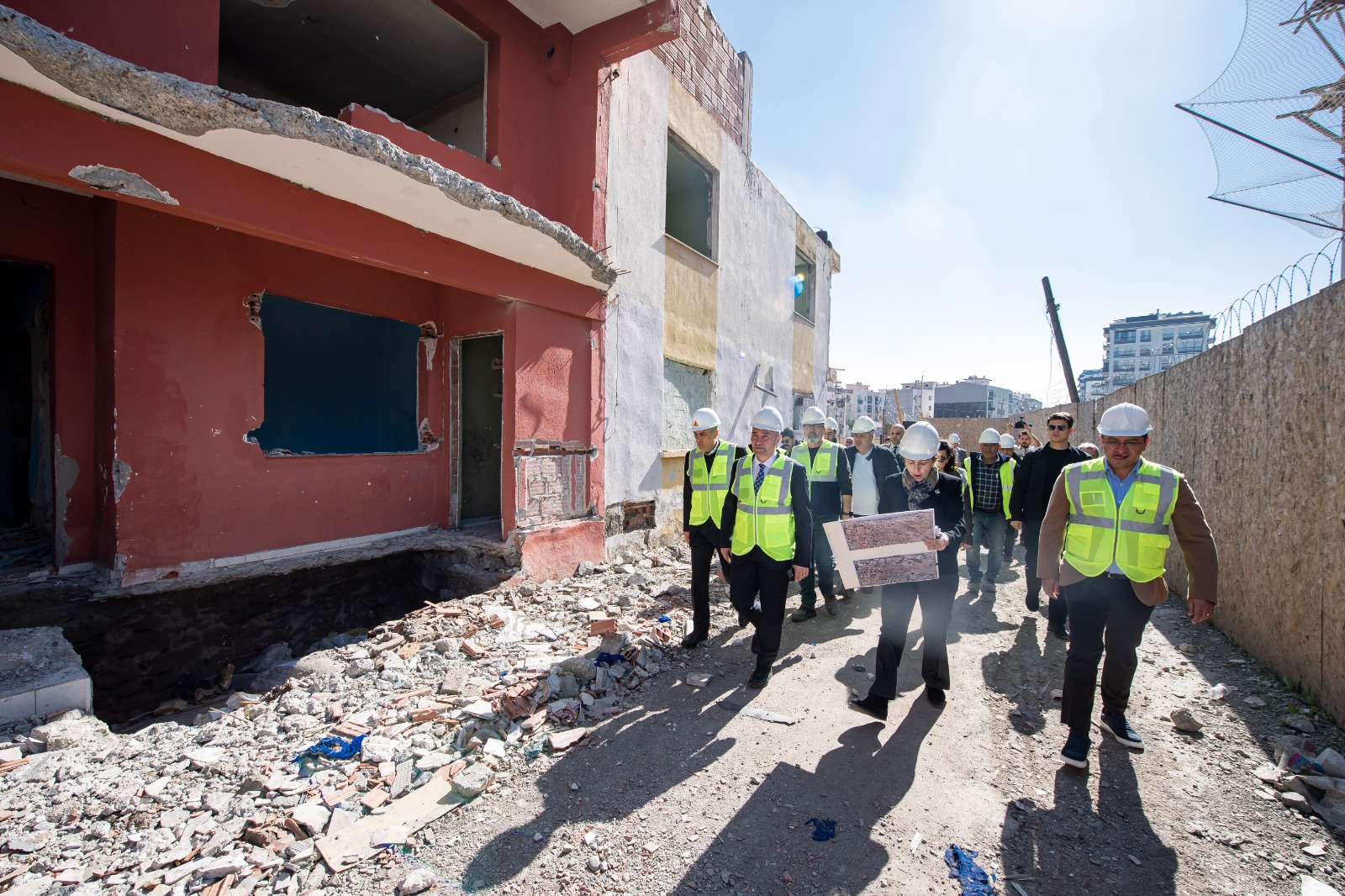 Saha gezisinde konuşan Başkan Soyer, “Burada temel attığımız günü hatırlıyorum. O günden bugüne binaların bu kadar yükselmiş olmasının çok değerli olduğunu söylemeliyim. Arkadaşlarımız canla başla çalışıyorlar. Bir yandan da uzlaşması sağlanan, tapusu devrolunan yerlerin yıkımıyla ilgili süreç devam ediyor. Bugün o son kalan bölgelerin yıkım çalışması yapılıyor” dedi.