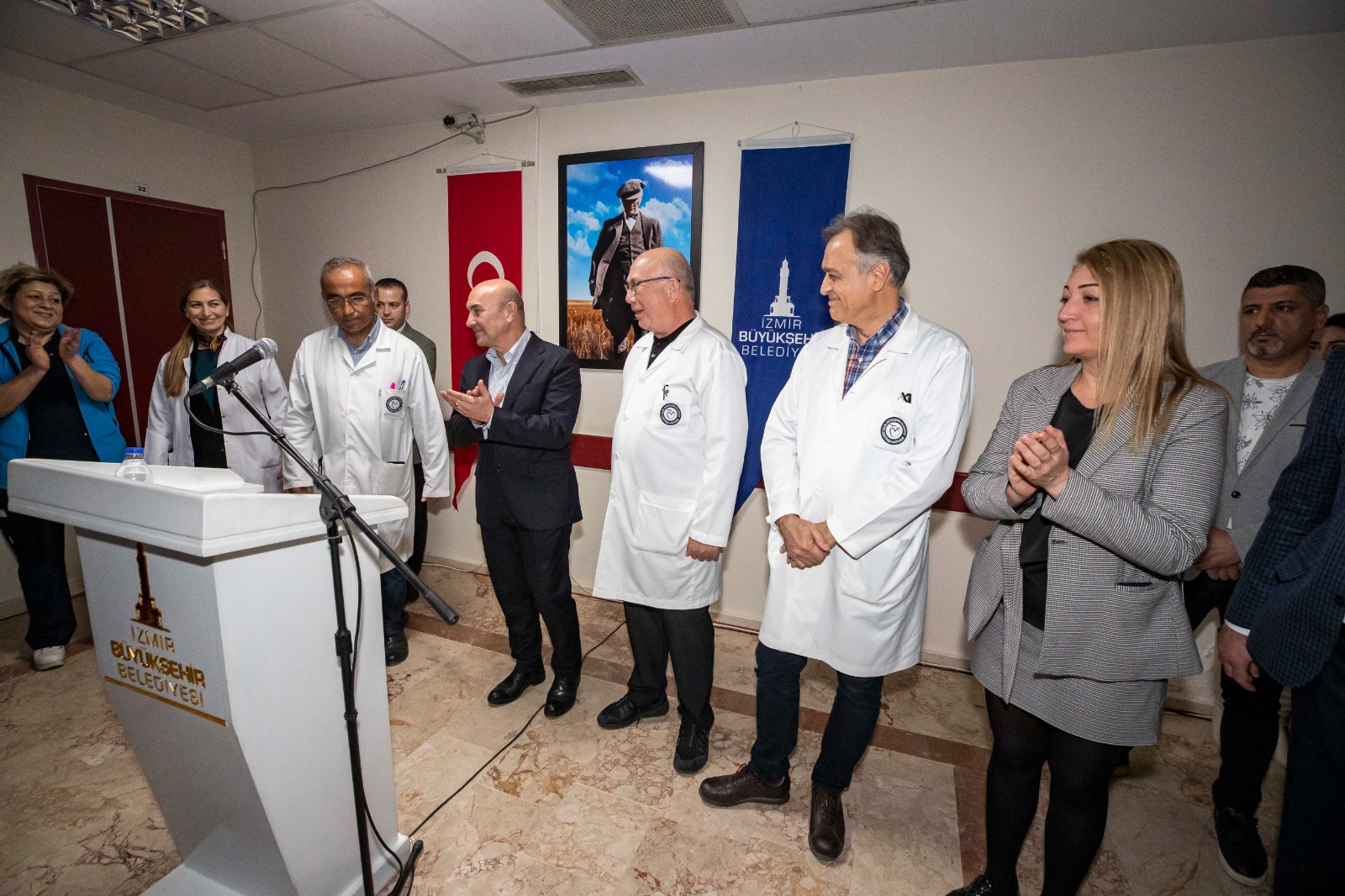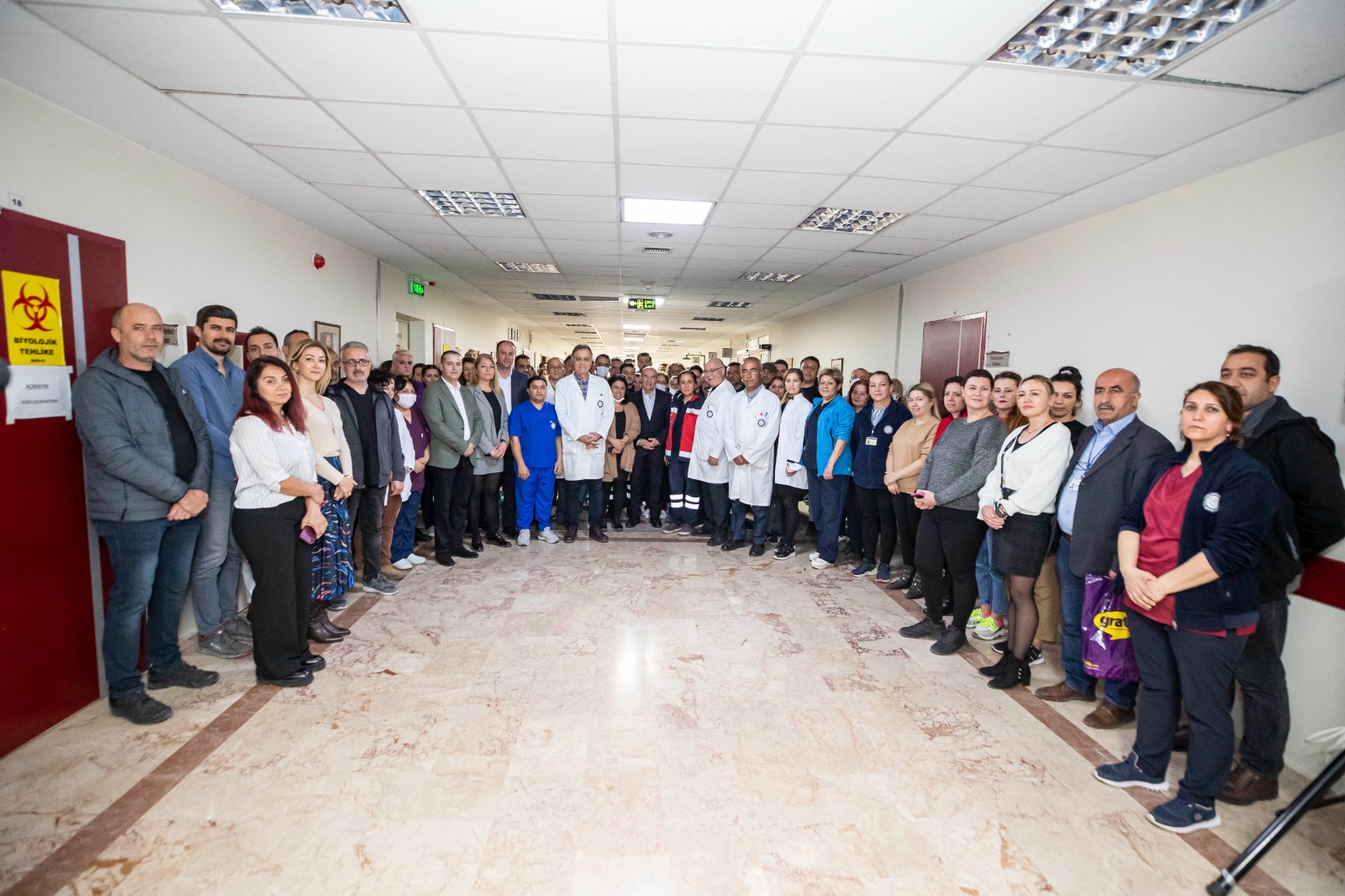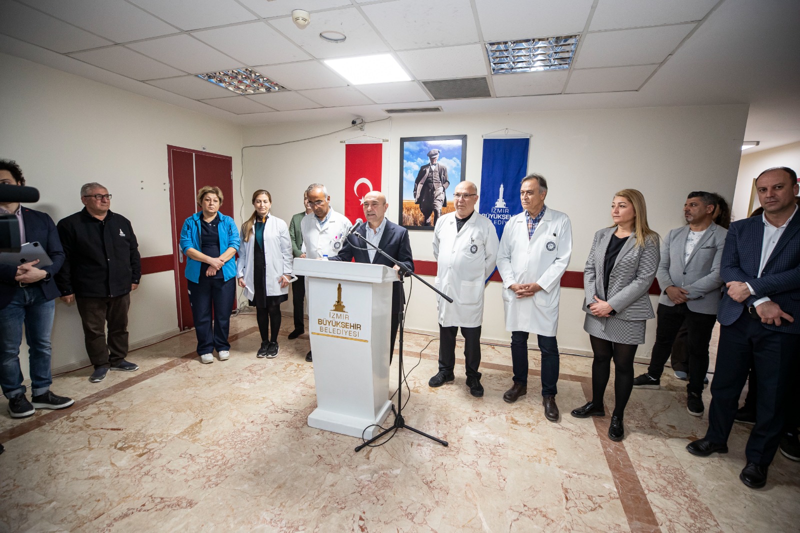 Başhekim Op. Dr. Kadir Devrim Demirel, Başhekim Yardımcıları Yavuz Uçar, Arif Kutsi Güder, Filiz Dağ ve hastane personelinin bulunduğu ziyarette konuşan Başkan Tunç Soyer, “Size bütün kalbimle çok teşekkür ediyorum. Sizin varlığınız bizlere o kadar büyük güç, o kadar büyük umut ki… Sizinle gerçekten gurur duyuyorum. Biz sadece yemek yardımı gıda yardımı yapmıyoruz. Sahra hastanesi de kurduk. Bu bambaşka bir şey. Büyük gurur. Çok zor şartlarda mesleğinizi yaptığınız için size minnettarım” diye konuştu.