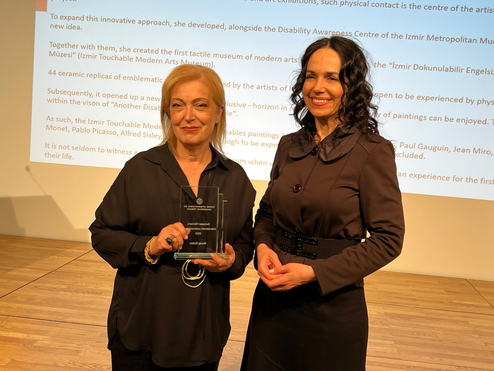 İki yıl önce İzmir Büyükşehir Belediyesi'nin desteğiyle İzmir Dokunulabilir Engelsiz Modern Sanat Müzesi’nde (İZDEM) "Dokunulabilir Tablolar" projesinin ev sahibi olduğunu ifade eden sanatçı, “İZDEM ülkemizde ve dünyada türünün ilk örneğidir. Kapsayıcılığın bir simgesi olarak müze 44 yardım çalışmasına tam erişim sağlıyor. Türkiye içinde ve dışında yapılacak projeler için de en büyük gurur kaynağımız ve umut ışığımız oldu. İzmir Belediye Başkanı Tunç Soyer'e ve belediye çalışanlarına, büyük destekçimiz Türkiye Görme Engelliler Kütüphanesi'ne ve projelerimizde emeği geçen herkese teşekkür ederim. Onlar adına bu ödülü almaktan onur duyuyorum” ifadelerini kullandı.