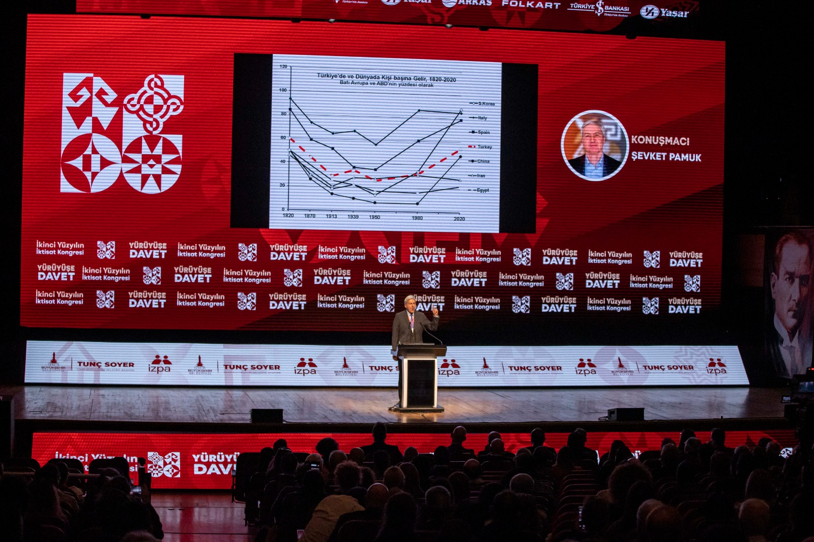 İkinci Yüzyılın İktisat Kongresi, üçüncü gününde “Yürüyüşe Davet” sloganıyla başladı. Gazeteci Özlem Gürses’in sunumunu yaptığı üçüncü gün oturumunun ilk konuşmacısı Boğaziçi Üniversitesi Öğretim Üyesi Prof. Dr. Şevket Pamuk oldu. Türkiye’nin Batı Avrupa ve Amerika’ya göre iki yüz yıllık kişi başına düşen milli gelir grafiğini gösteren Şevket Pamuk, İktisat Kongresi’nden sonra Türkiye’nin hızlı bir yükselişe geçtiğini söyledi.