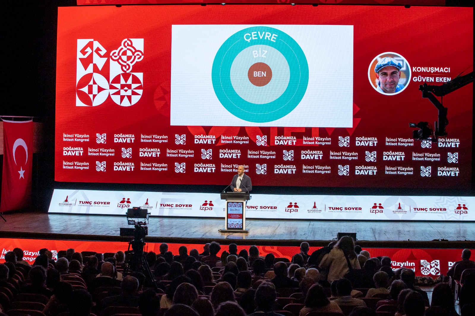 İkinci Yüzyılın İktisat Kongresi’nin dördüncü gününde konuşan İzmir Büyükşehir Belediyesi Başkan Danışmanı Dr. Güven Eken “Döngüsel Kültür Şehirleri” başlığıyla bir sunum yaptı. Eken, “Geleneksel anlamda ben kelimesi yaşadığımız çağda en temel kutsalımız haline geldi. Bizim dışımızdaki canlılar için ben kelimesi geçerli değil. Ben olunca biz kümesi de beraberinde geliyor. Ben ve bizim dışımızdaki her şey de iklim, biyoçeşitlilik, ekosistem bunlar da çevre oluyor. Bizim dışımızdaki birçok canlı yaşamı böyle algılamıyor. Çevre dediğimiz şey, hepimizin parçası olduğumuz doğa, evren, yer kürenin bütünlüğü. Bu iki algı yaşamda aldığımız her türlü kararın zemini aslında” dedi.
