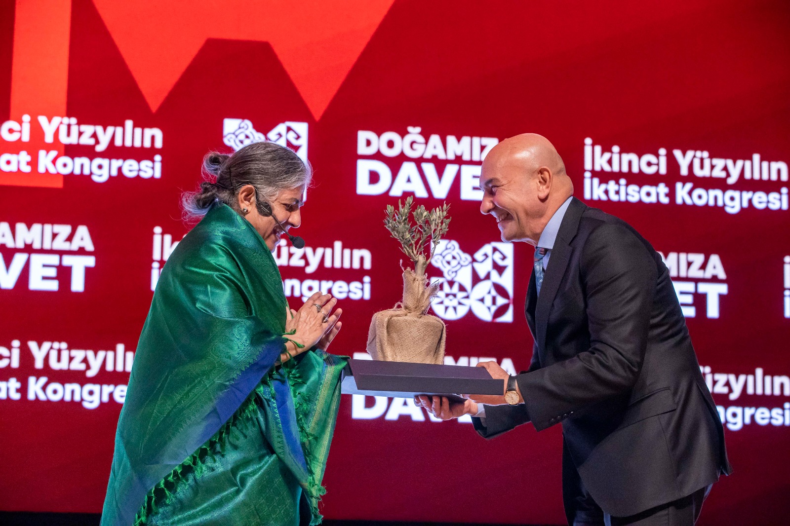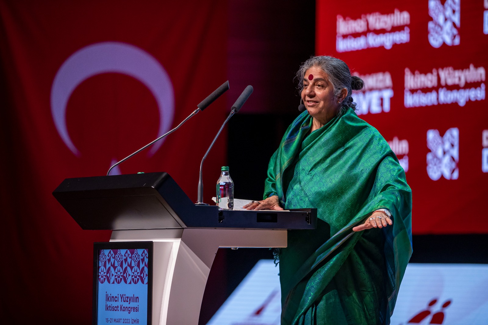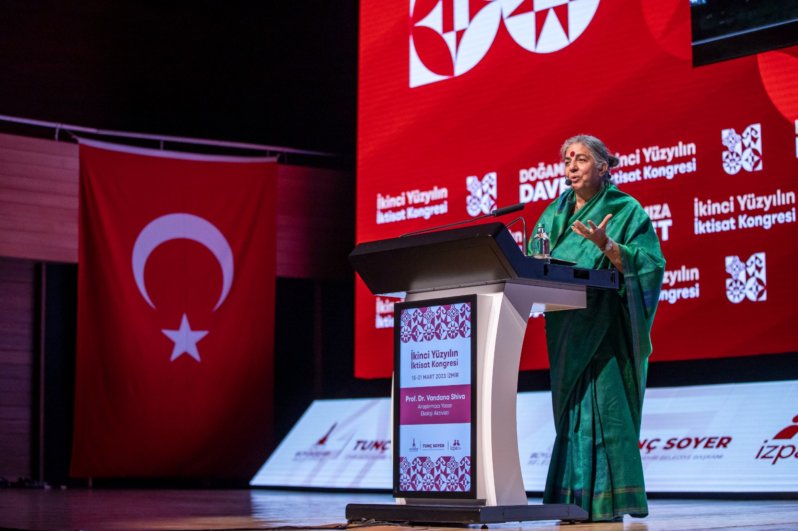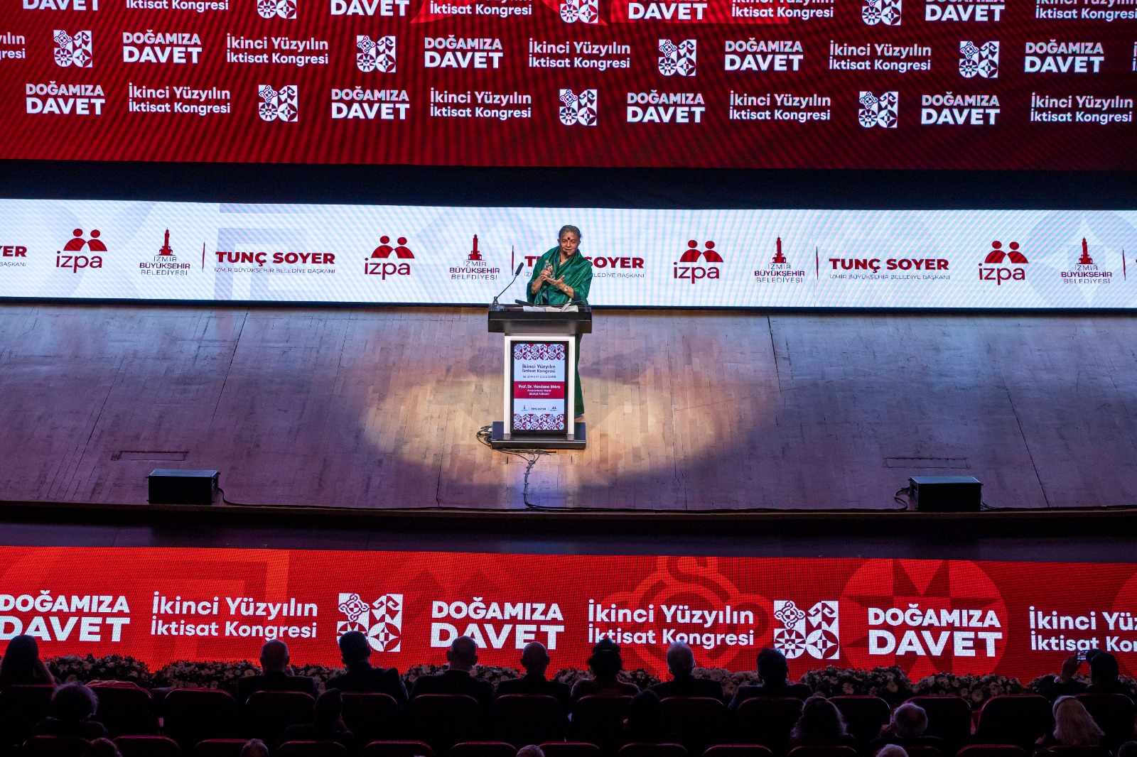 İzmir Büyükşehir Belediyesi tarafından düzenlenen İkinci Yüzyılın İktisat Kongresi'nin dördüncü gününde araştırmacı, yazar ve ekolojik aktivist Prof. Dr. Vandana Shiva “Doğa Ana ve İnsanlığın Geleceği” başlıklı bir konuşma yaptı. Depremde hayatını kaybeden insanlar için rahmet dileyen Prof. Dr. Shiva, “Küçük çocuklara yardım ettiğiniz ve bunu Atatürk döneminden beri devam ettirdiğiniz için teşekkürler. Doğanın ve çevrenin korunması zihnin ürünü olmalı. Dünyayı nasıl algıladığımızla alakalı. Ben Himalaya ormanlarında büyüdüm ve oradaki ağaçların bazıları buradaki meşelere benziyordu. Aylarca ormanda yaşadım ama orman olmayan yerlerde yaşamak çok zor. Yer altındaki ve yer üzerindeki gizli değerlerle ilgili doktoramı yaptım. Sizin tarihinizde de cumhuriyetin kurulduğu ilk yıllar bağımsızlık mücadelesiyle ilgiliydi. Umutları nasıl tekrar kazanacağız? Umudunu tekrar içinde tut ve büyüt” şeklinde konuştu.