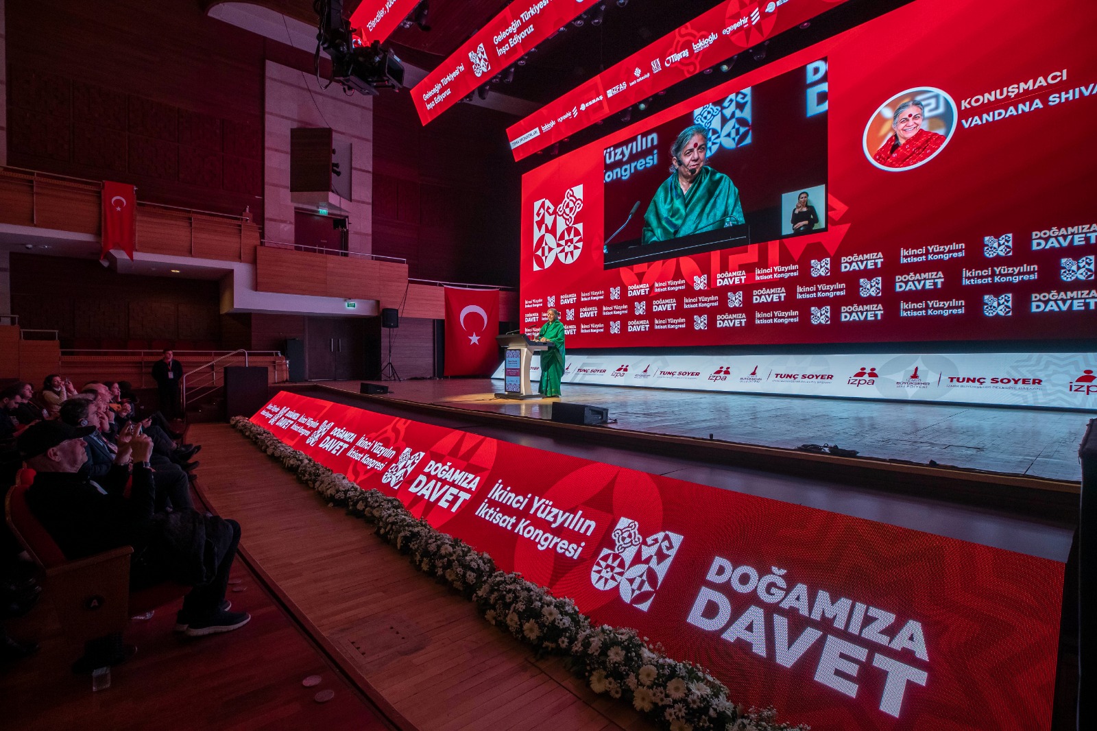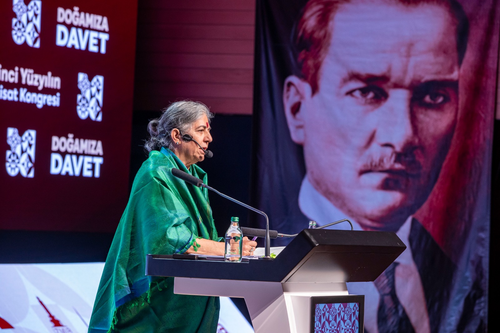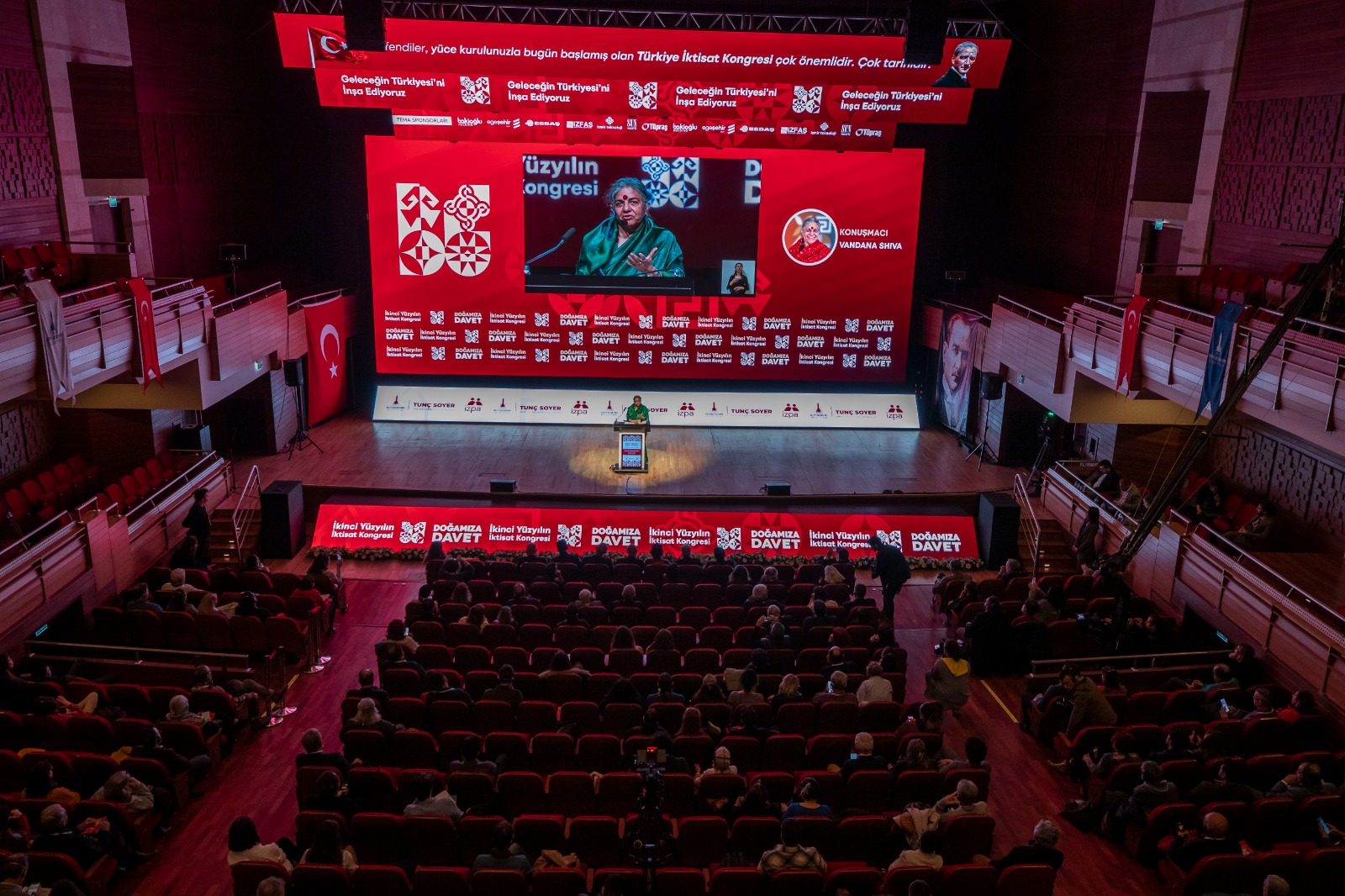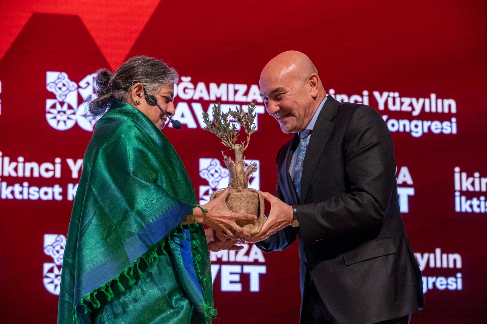 İzmir Büyükşehir Belediyesi tarafından düzenlenen İkinci Yüzyılın İktisat Kongresi'nin dördüncü gününde araştırmacı, yazar ve ekolojik aktivist Prof. Dr. Vandana Shiva “Doğa Ana ve İnsanlığın Geleceği” başlıklı bir konuşma yaptı. Depremde hayatını kaybeden insanlar için rahmet dileyen Prof. Dr. Shiva, “Küçük çocuklara yardım ettiğiniz ve bunu Atatürk döneminden beri devam ettirdiğiniz için teşekkürler. Doğanın ve çevrenin korunması zihnin ürünü olmalı. Dünyayı nasıl algıladığımızla alakalı. Ben Himalaya ormanlarında büyüdüm ve oradaki ağaçların bazıları buradaki meşelere benziyordu. Aylarca ormanda yaşadım ama orman olmayan yerlerde yaşamak çok zor. Yer altındaki ve yer üzerindeki gizli değerlerle ilgili doktoramı yaptım. Sizin tarihinizde de cumhuriyetin kurulduğu ilk yıllar bağımsızlık mücadelesiyle ilgiliydi. Umutları nasıl tekrar kazanacağız? Umudunu tekrar içinde tut ve büyüt” şeklinde konuştu.
