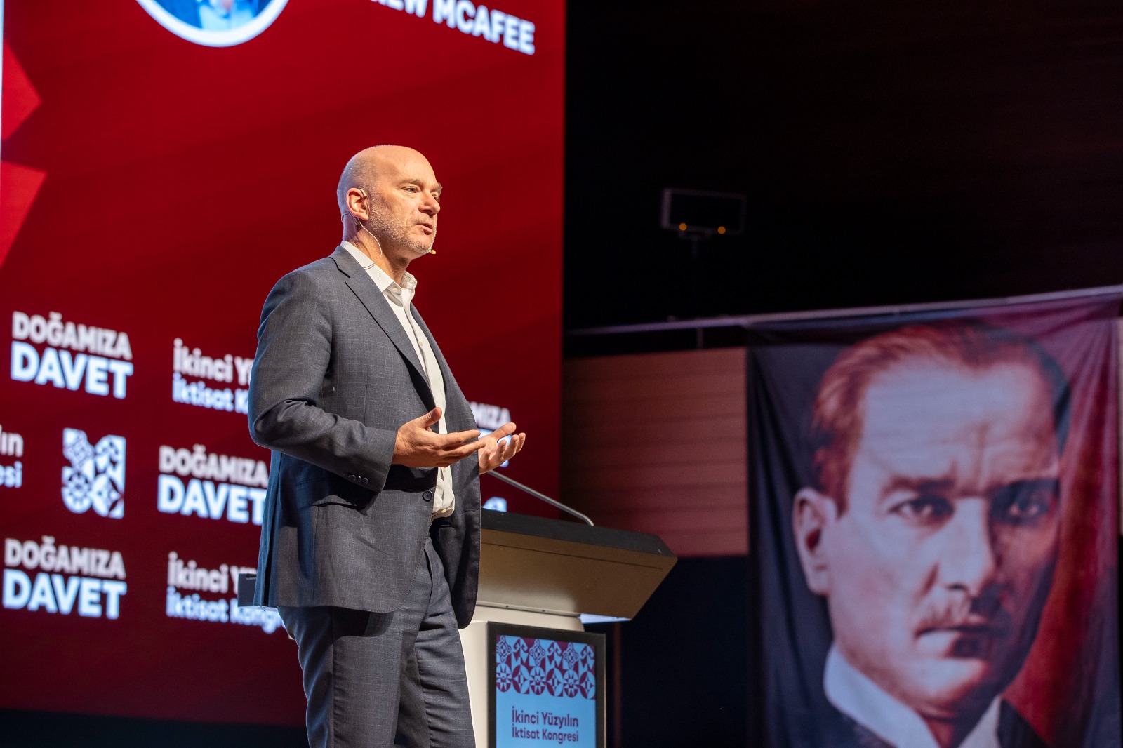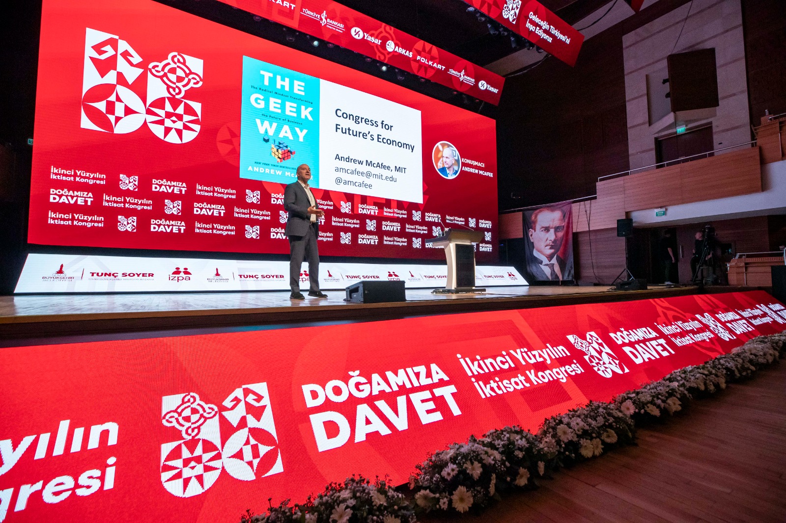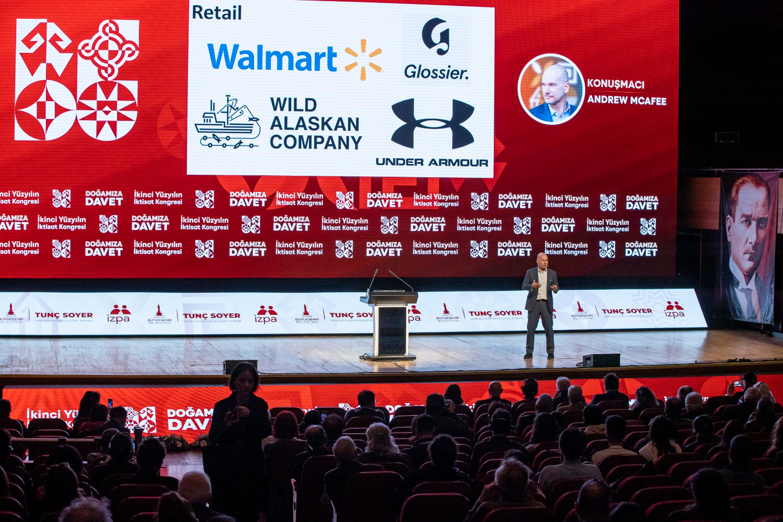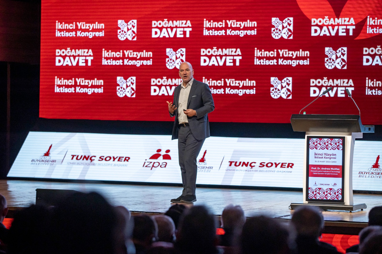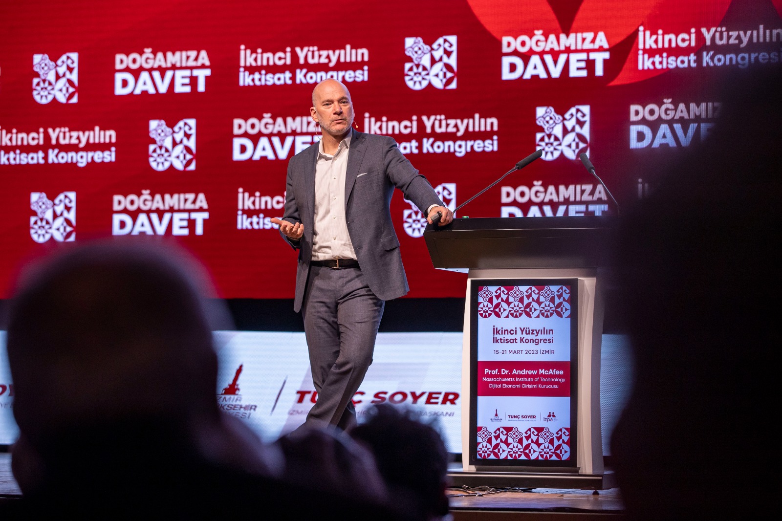 İzmir Büyükşehir Belediyesi tarafından düzenlenen İkinci Yüzyılın İktisat Kongresi’nin dördüncü gününde Massachusetts Teknoloji Enstitüsü Dijital Ekonomi Girişimi Kurucusu Prof. Dr. Andrew McAfee “Demateryalizasyonun Gücü-Daha Az Doğal Kaynak Tüketirken Ekonomiyi Nasıl Büyütebiliriz ve Dijitalleşmeyi Kullanabilir Miyiz?” başlığıyla sunum yaptı.