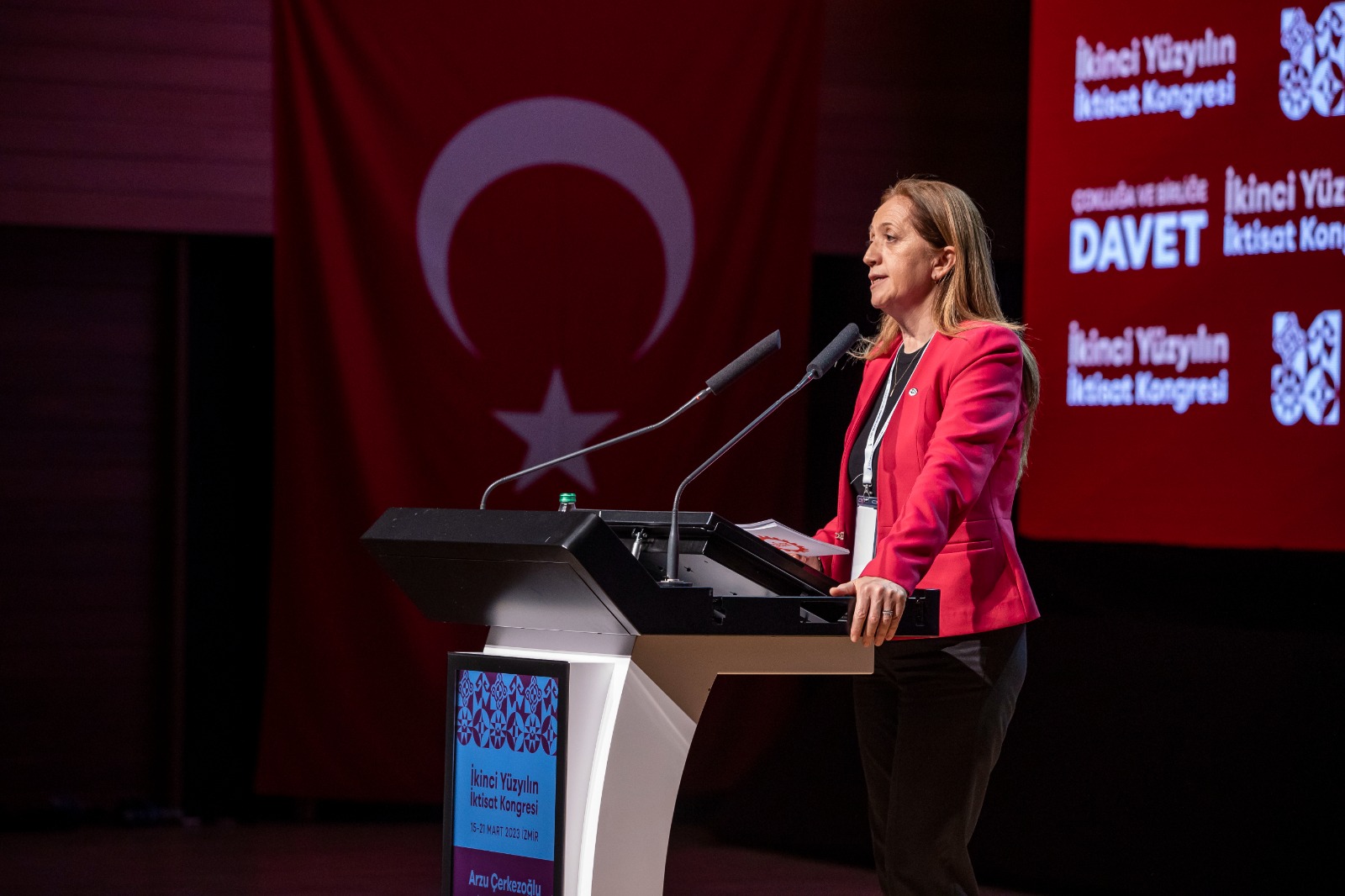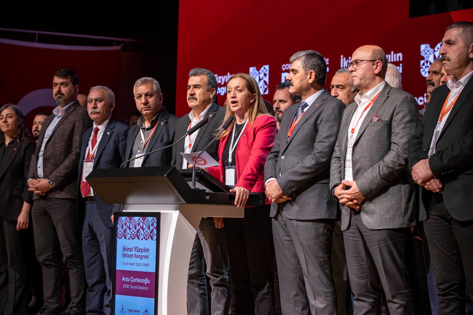 İzmir Büyükşehir Belediyesi tarafından düzenlenen İkinci Yüzyılın İktisat Kongresi’nde konuşan DİSK Genel Başkanı Arzu Çerkezoğlu, “Tüm işçileri, çalışanları dünyadaki en uzun çalışma saatlerine, en düşük ücretlere, en örgütsüz çalışmaya, en çok ölümlü iş cinayetine mahkûm eden bu distopyaya mahkûm değiliz. Demokrasi işçinin ekmeğidir. Meselemiz, Türkiye için demokrasi, toplum için ekonomidir. Meselemiz, demokratik bir cumhuriyeti inşa etmektir” dedi.
