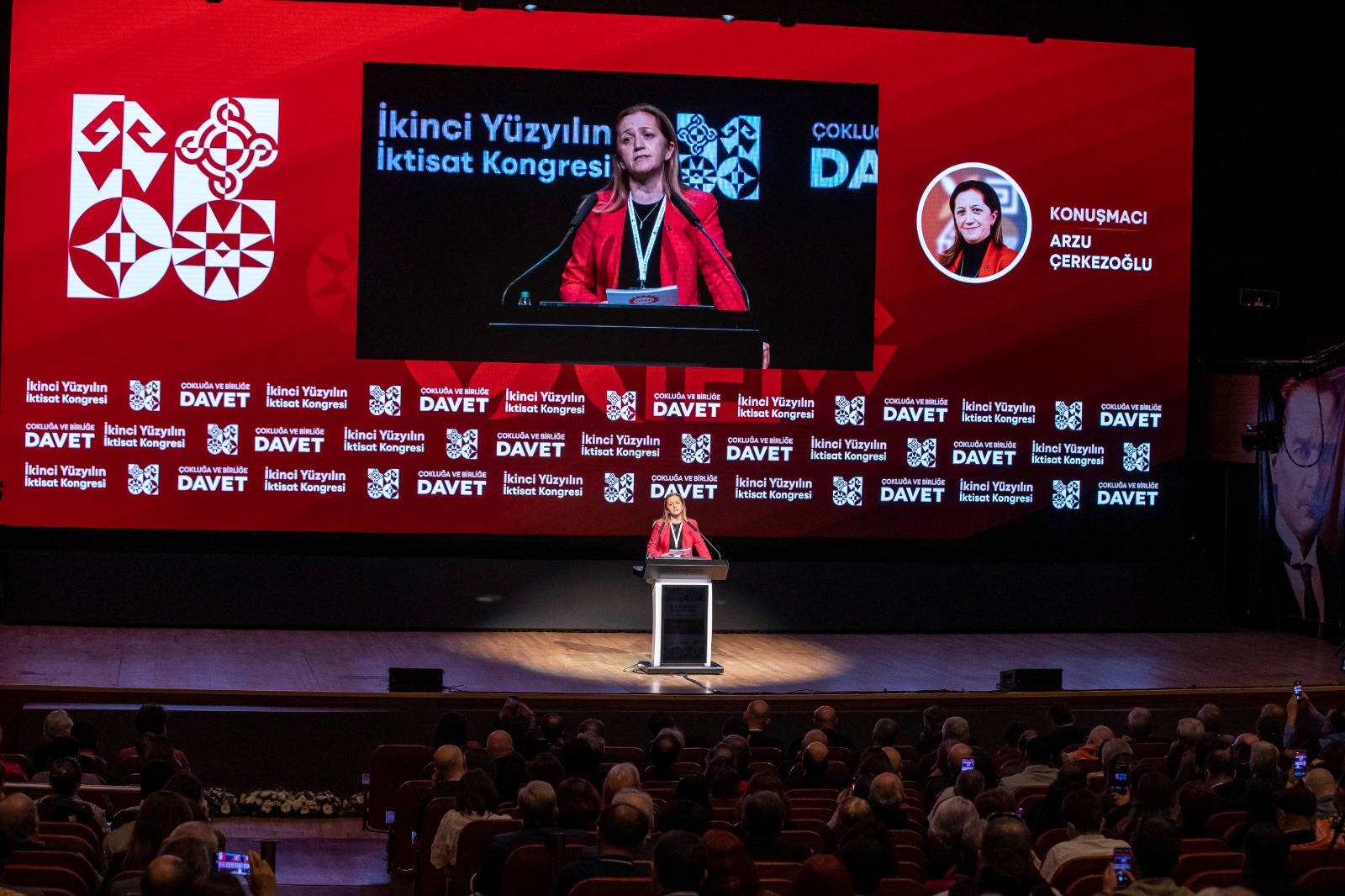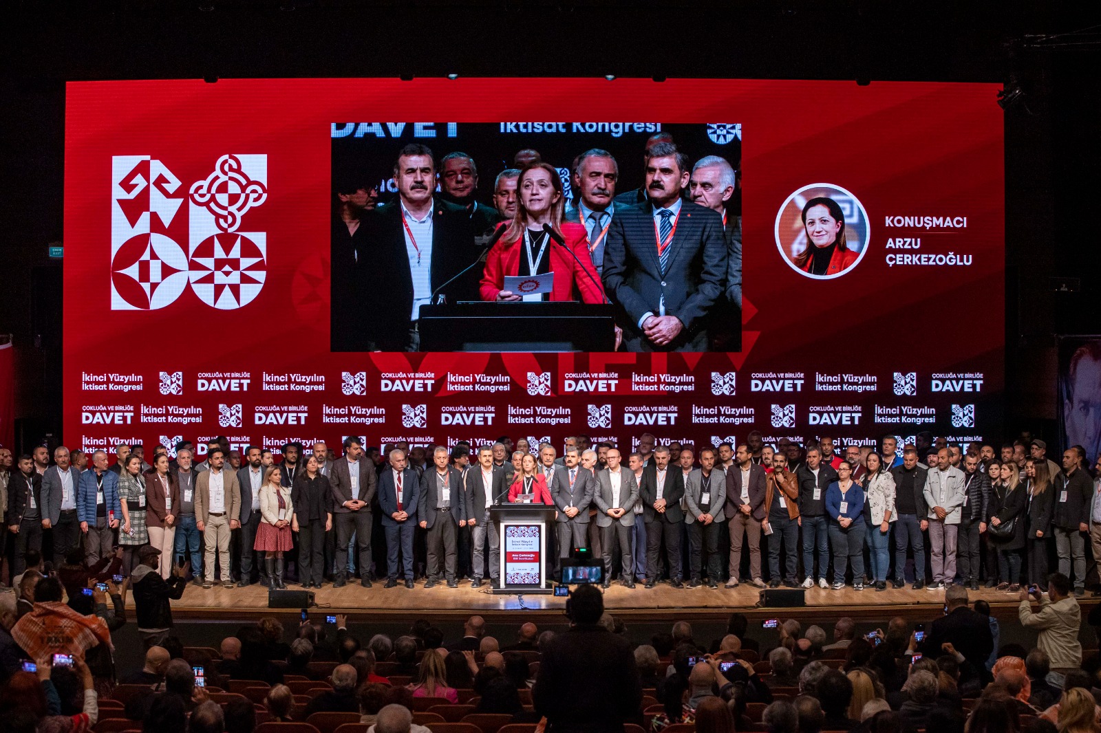 İkinci Yüzyılın İktisat Kongresi’nin “Çokluğa ve Birliğe Davet” temalı son gününde konuşan DİSK Genel Başkanı Arzu Çerkezoğlu, “İkinci Yüzyılda Emek Eksenli Yeniden Kuruluş” başlığı altında sunum yaptı. Arzu Çerkezoğlu, 8 aydır bu çalışmanın sürdüğünü anımsatarak, “Bizim de katkı sunmaya çalıştığımız, Tunç Başkan'ın tüm toplantılara bizzat kendisinin katıldığı ve büyük bir titizlikle yürüttüğü bu çalışma son derece önemli. Bu kongreyi, çok özel bir tarihsel dönemde gerçekleştiriyoruz. 100 yıl önce birinci İktisat Kongresi toplandığında hem dünyada hem de bu topraklarda yeni bir dönemin ilk adımları atılıyordu. Zamanın ruhu denir ya, 100 yıl sonra bugün de hem dünyamız hem de ülkemiz açısından yeni bir çağın eşiğinde bu kongreyi yapıyoruz. Bu sistemin adına ne dersek diyelim; emperyalizm, kapitalizm, neoliberalizm... Nasıl tarif edersek edelim, bu sistemin tüm dünyada ve ülkemizde de işçi sınıfına, kadınlara, emekçilere, gençlere, bütün dünya halklarına vaat edeceği bir şey kalmadı. Bütün masallar bitti, bütün yaldızlar döküldü. Eşitsizliklerin alabildiğine arttığı, iklim değişikliğinden, su krizi, enerji krizi, gıda krizine kadar, sağlığın, eğitimin, sosyal güvenliğin özelleştirilmesinden işsizliğe kadar, bütün yıkıcı sonuçlarını yaşadığımız bu düzen artık iflas etti” dedi.