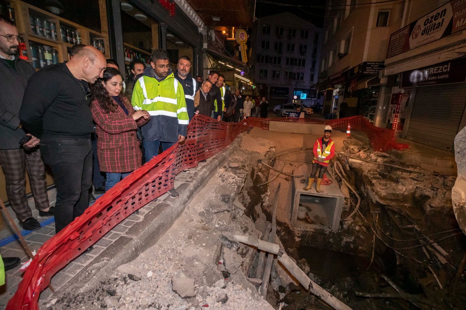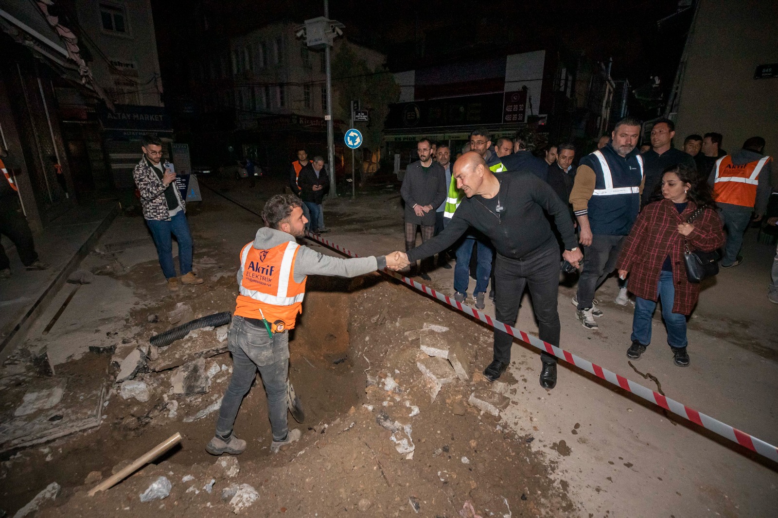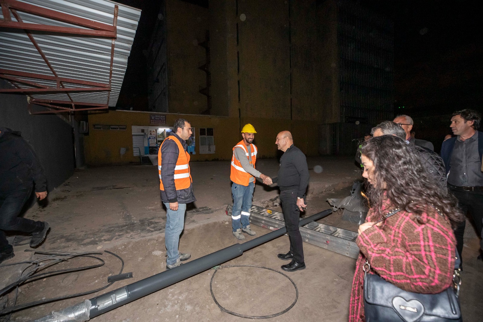 Kemeraltı’nda esnafın işlerini aksatmamak için çalışmaları gece sürdürdüklerini belirten Başkan Tunç Soyer, “Kemeraltı'nın 50 yıllık sorununu çözüyoruz. Çok zor ve büyük bir çalışma. Sokakların altındaki bütün altyapıyı değiştiriyoruz. Altyapının ardından yol yüzeyini taşla kaplıyoruz. Kemeraltı esnafımız bu süreçte sıkıntı çekiyor. Vatandaşlar da alışveriş yaparken tabii ki sıkıntı yaşıyor. Ama bu büyük adımı atmazsak Kemeraltı'nın o hayalini kurduğumuz güzel günlerine ulaştırmamız mümkün değil” dedi.
