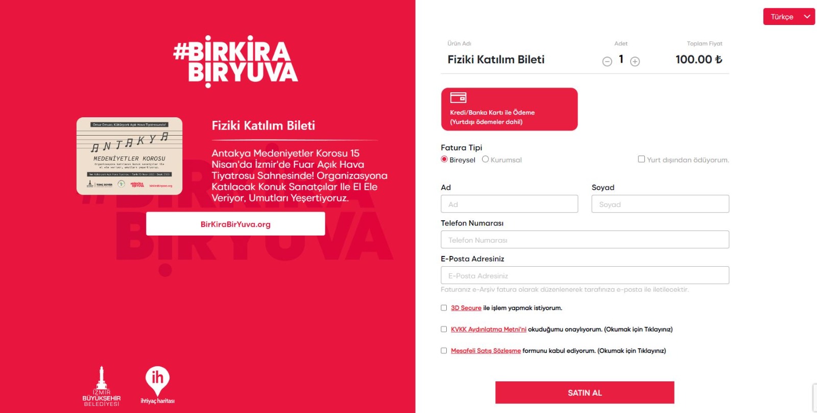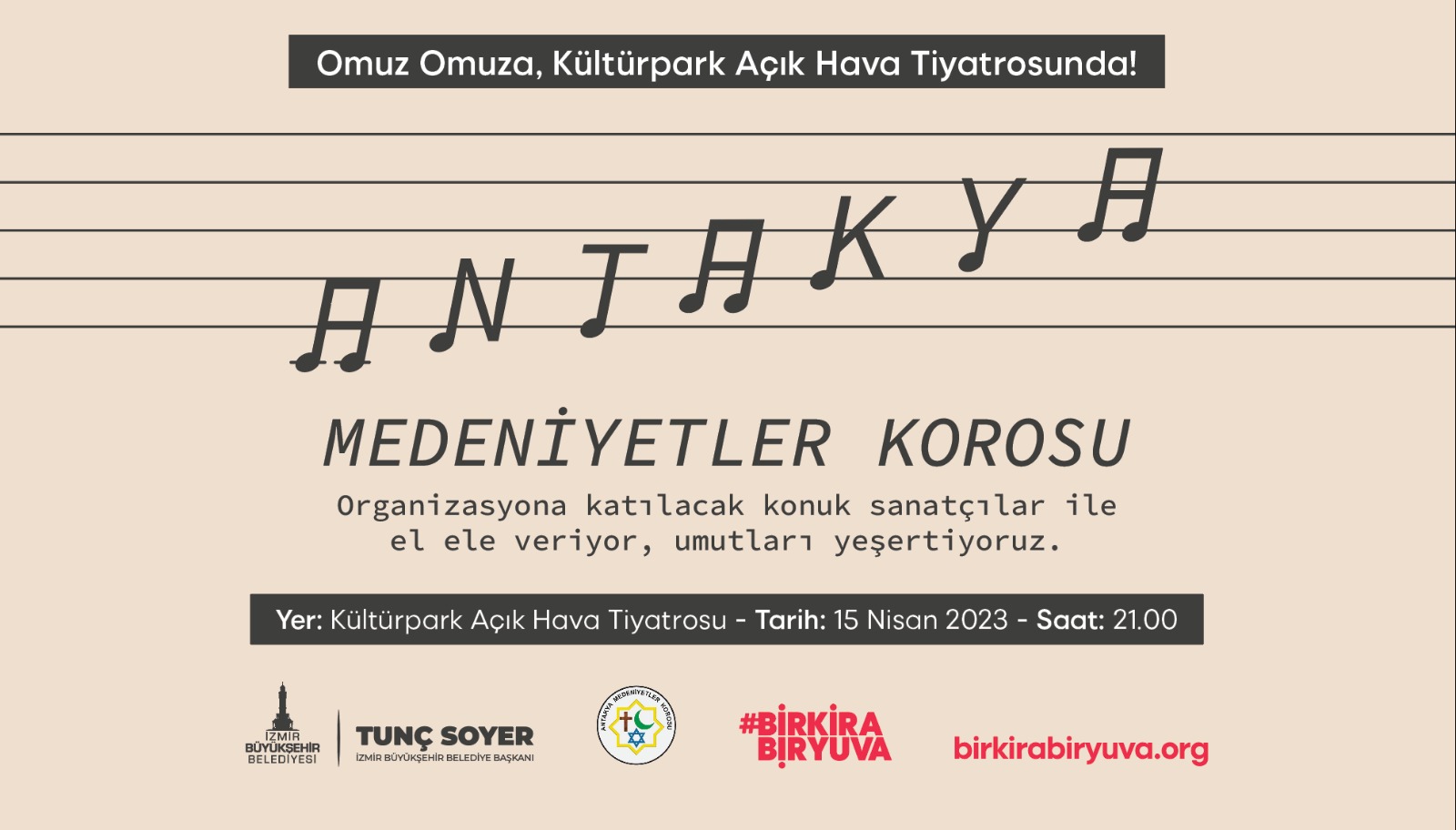 Kahramanmaraş merkezli ve 11 ili etkileyen depremlerin ardından vatandaşların barınma sorununa çözüm bulmak için “Bir Kira Bir Yuva” kampanyasını başlatan İzmir Büyükşehir Belediyesi, dayanışma konserleriyle yaraları sarmayı sürdürüyor. 7 sanatçısını kaybeden, birçok üyesi de enkaz altından çıkartılan Antakya Medeniyetler Korosu 15 Nisan Cumartesi akşamı Kültürpark Açıkhava Tiyatrosu’nda konser verecek. Yılmaz Özfırat'ın yönetiminde konuk sanatçıların katılımıyla yapılacak konser 21.00’de başlayacak. Biletler 100 lira bedelle birkirabiryuva.org adresinden satışa sunuldu. Konsere gidemeyecek olanlar ise 50 TL tutarındaki katılımsız bilet seçeneğiyle bu dayanışmaya katkıda bulunabilecek.